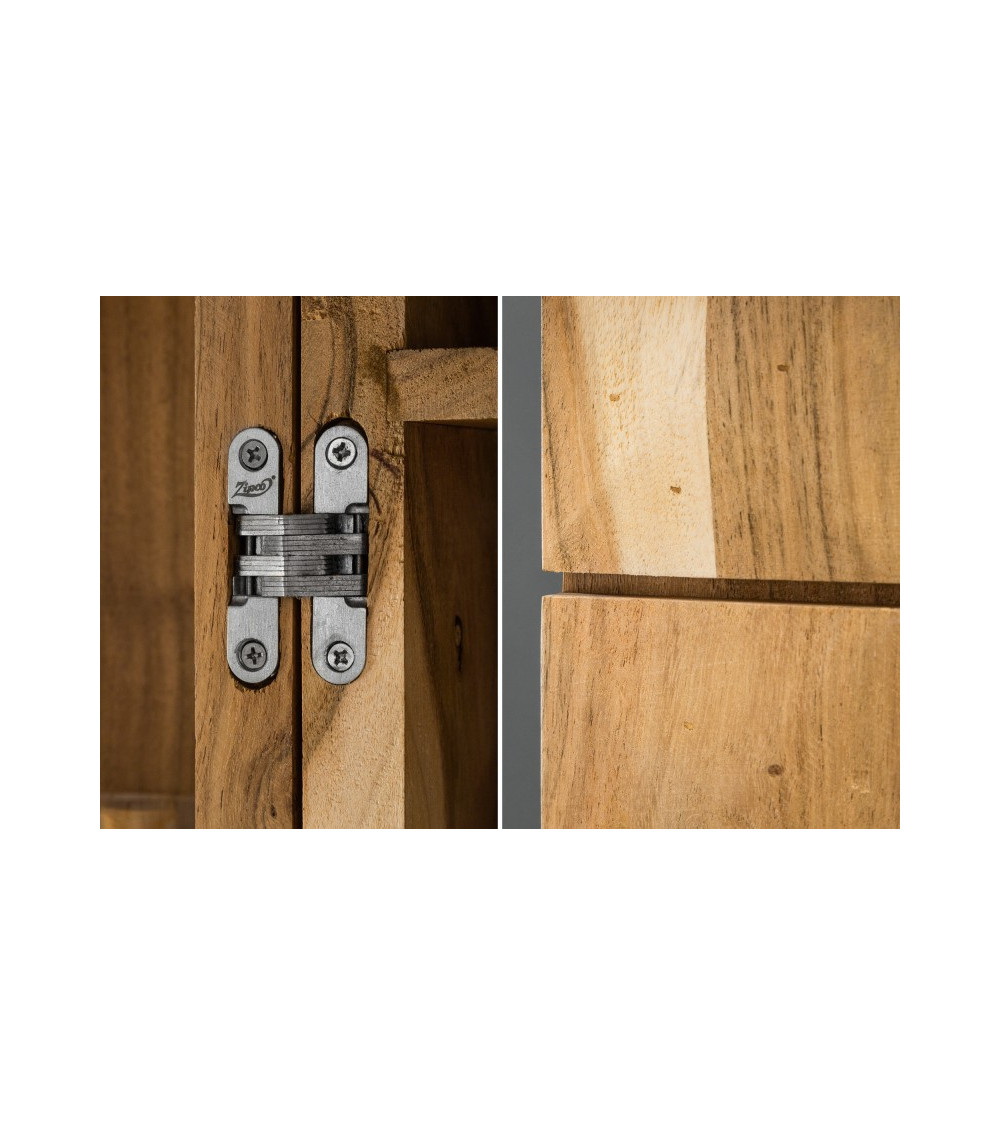 El acabado natural de la madera maciza de acacia, sellada y barnizada, resalta los matices y el veteado único de la madera, aportando un toque de calidez a cualquier decoración. Su ingenioso diseño incluye un espacioso cajón central para sus accesorios de bar, compartimentos modulares para sus botellas y vasos, así como estantes adicionales ocultos tras sus puertas laterales, perfectos para guardar todo lo necesario para agasajar a sus invitados con estilo.