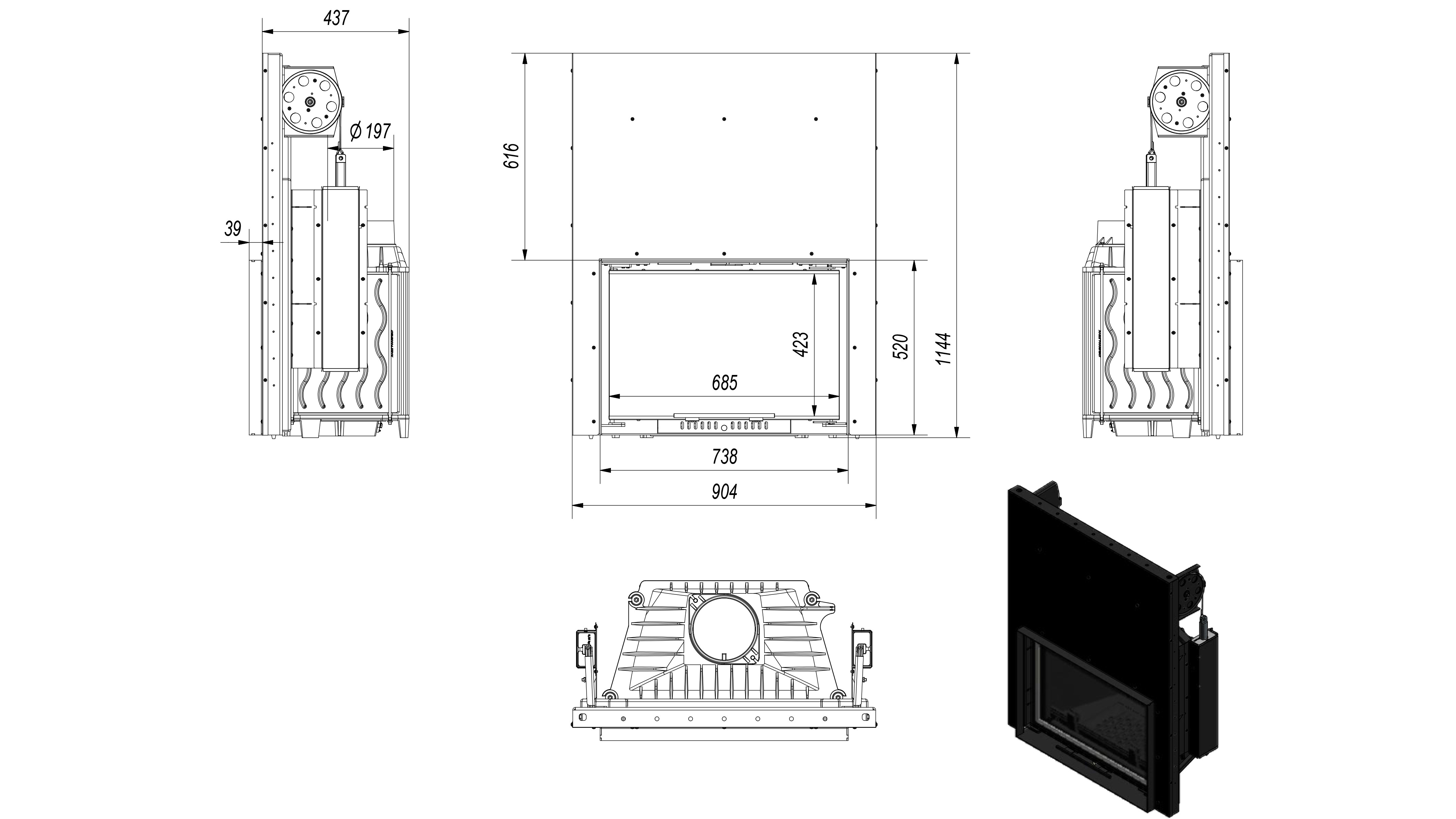 - Vidrio decorativo resistente al calor que soporta temperaturas de hasta 660 °C. Esto le da a la chimenea un aspecto moderno y elegante, ampliando visualmente el frente del inserto.