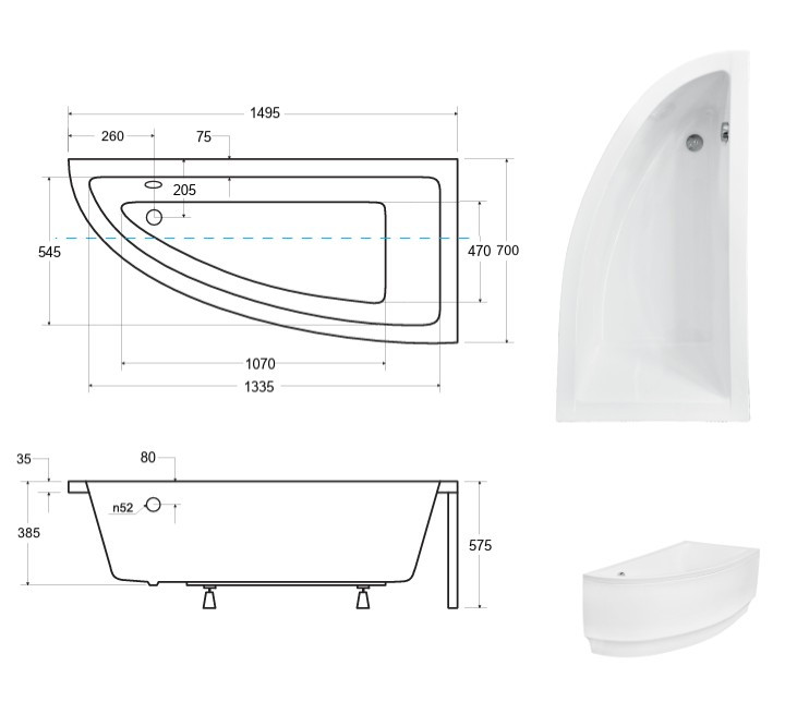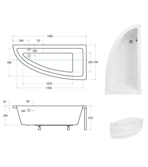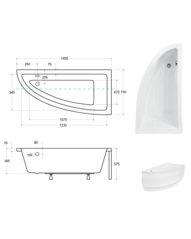 Eckbadewanne ORIEGO 150 cm rechts mit Schürze