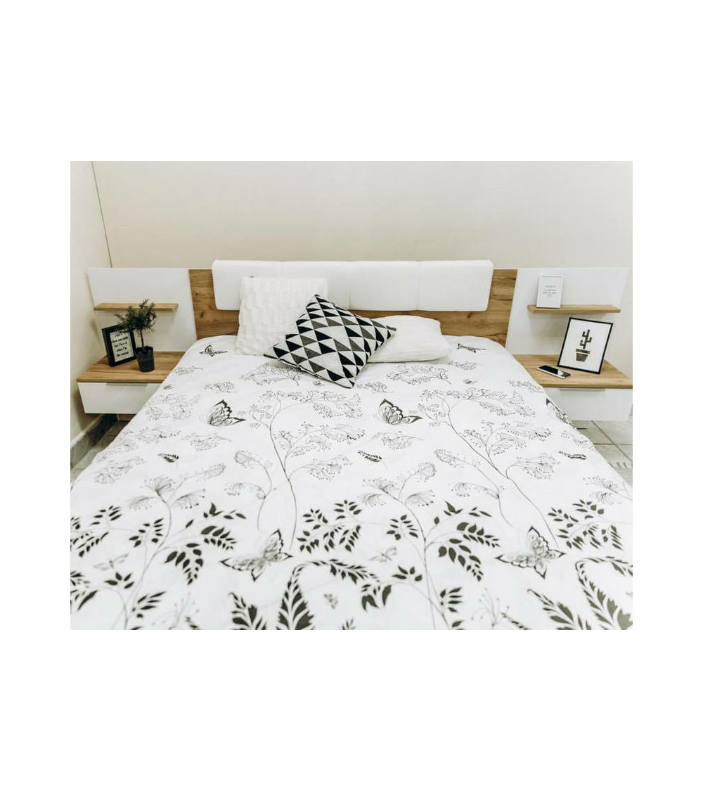 Belle CONCEPTION pour le look épuré de cette chambre. Les pieds du lit en biseau, le couchage qui parait suspendu ainsi que les tables de chevet, la commode très minimaliste et l'immense armoire font de cette chammbre un incontournable, une valeur sûre de votre futur style de vie.