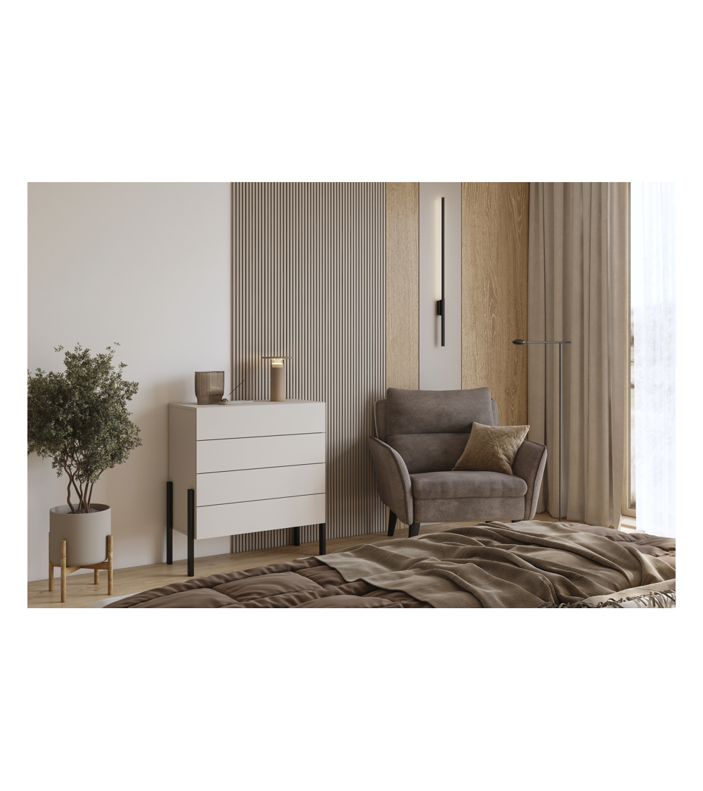La chambre complète BETA possède un style unique , ses lignes sont sobres et son caractère nait des coloris opposés dans cette sélection de meuble. Une couleur de bois naturel soulignée par des notes de blanc qui viennent donner du corps à cet ensemble.