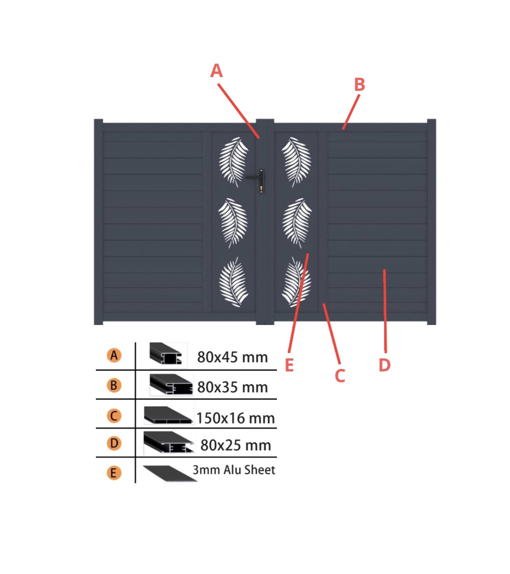 Fabricado en aluminio pintado al polvo, resiste la corrosión, el viento y no requiere mantenimiento. Su formato con dos hojas iguales y apertura hacia el interior ofrece practicidad y resistencia a largo plazo.