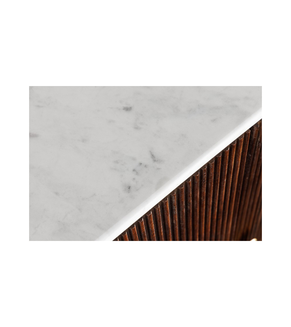 Con sus generosas dimensiones de 180 cm de longitud, 87 cm de altura y 45 cm de profundidad, LINEA es la encarnación perfecta de la elegancia retro. Su diseño se ve realzado por una suntuosa encimera de mármol blanco, que no sólo añade un toque de lujo, sino que también garantiza una superficie duradera y fácil de limpiar. La estructura principal del mueble es de madera maciza de mango, conocida por su resistencia y longevidad, y está cuidadosamente lacada para resaltar el veteado natural de la madera y ofrecer al mismo tiempo una protección adicional.