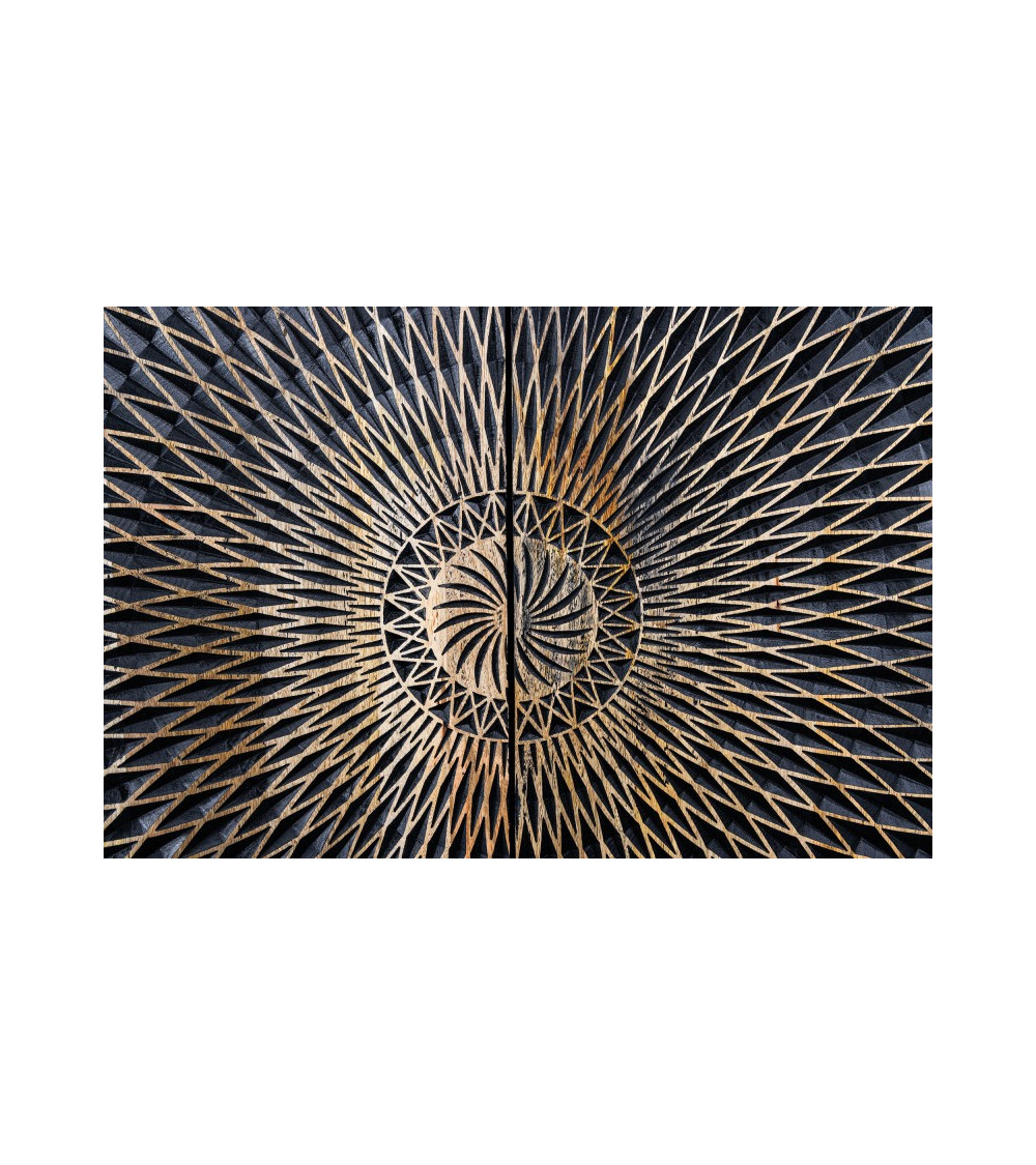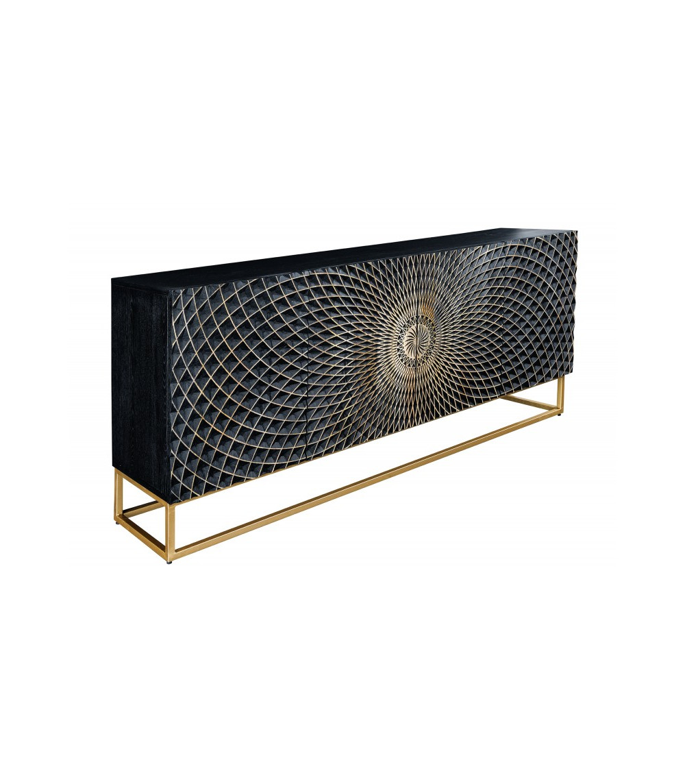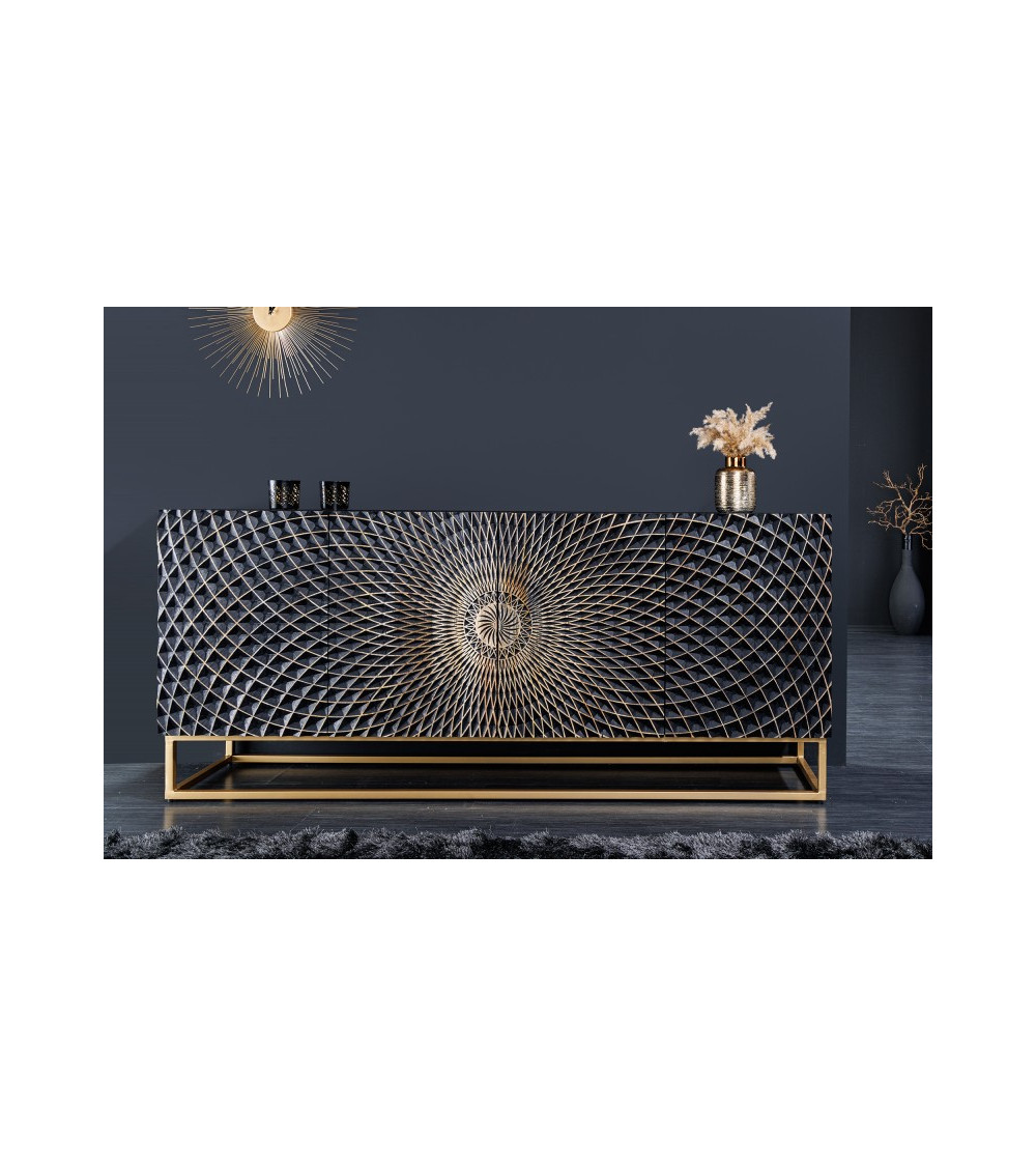 Los colores principales del mueble son el negro y la madera natural para el cuerpo y los frentes, con ornamentos en forma de mandala que presentan variaciones de color debido a las características de la madera de mango. El marco dorado añade un contraste elegante y sofisticado al conjunto.