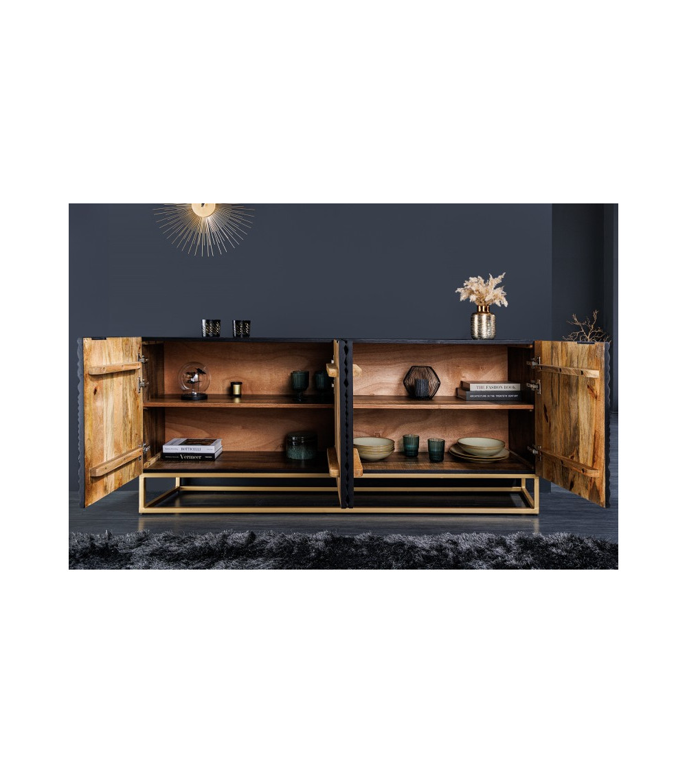 El cuerpo del mueble es de MDF lacado, que proporciona una estructura resistente y duradera. Los frentes, en madera de mango lacada, presentan tonalidades naturales que varían del marrón al amarillo, debido a las propiedades naturales de la madera, contribuyendo a la originalidad de cada pieza. La estructura, de hierro con recubrimiento de polvo, es dorada, lo que añade un toque de lujo y modernidad.