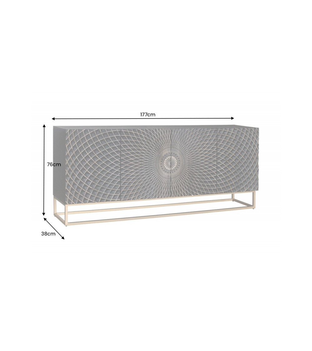 MANDALA es un aparador elegante y distintivo que presenta un diseño refinado y artístico. Los frentes están ricamente decorados con ornamentos de mandala, creando un patrón cautivador e intrincado. La exclusiva gradación de colores de la madera de mango hace que cada aparador sea realmente único, añadiendo un toque de originalidad y sofisticación a cualquier interior.