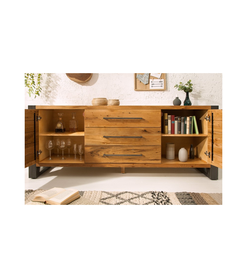 El frente del aparador es de roble silvestre macizo, cuidadosamente aceitado para realzar la belleza natural de la madera y protegerla al mismo tiempo. El cuerpo es de chapa de roble silvestre auténtico, con soporte de MDF, que proporciona una estructura resistente y duradera. La estructura metálica de color antracita añade un toque de modernidad y robustez a la pieza, creando un elegante contraste con la calidez de la madera.