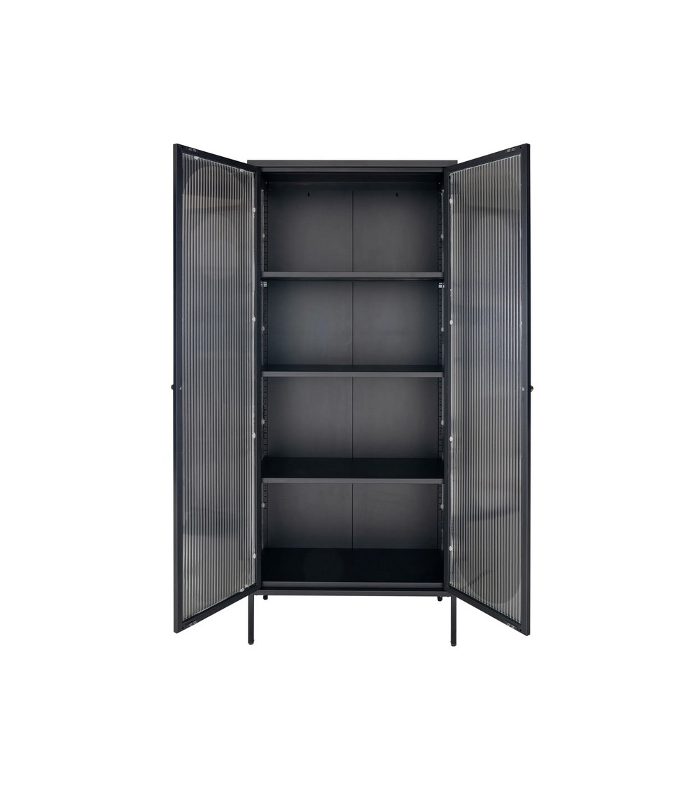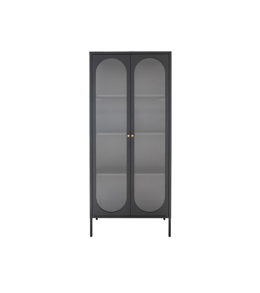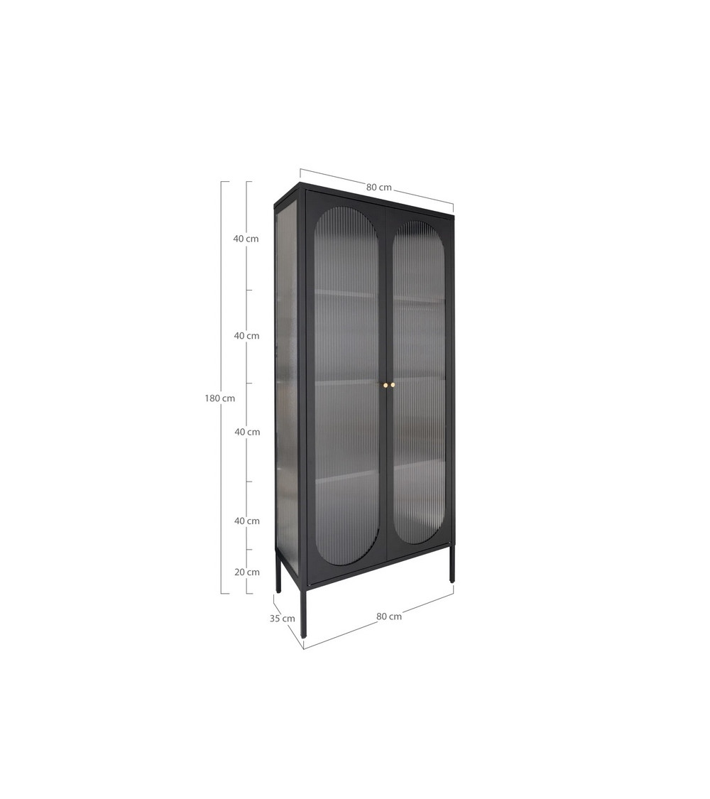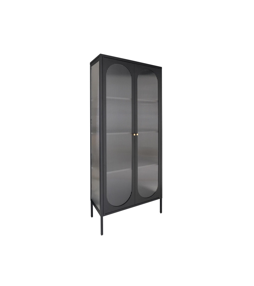 Su diseño moderno e industrial se realza con sus puertas de vidrio ondulado y su estructura de metal negro. Los tiradores dorados redondeados añaden un toque de sofisticación que se integra perfectamente en ambientes contemporáneos.