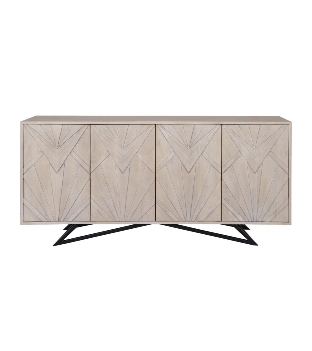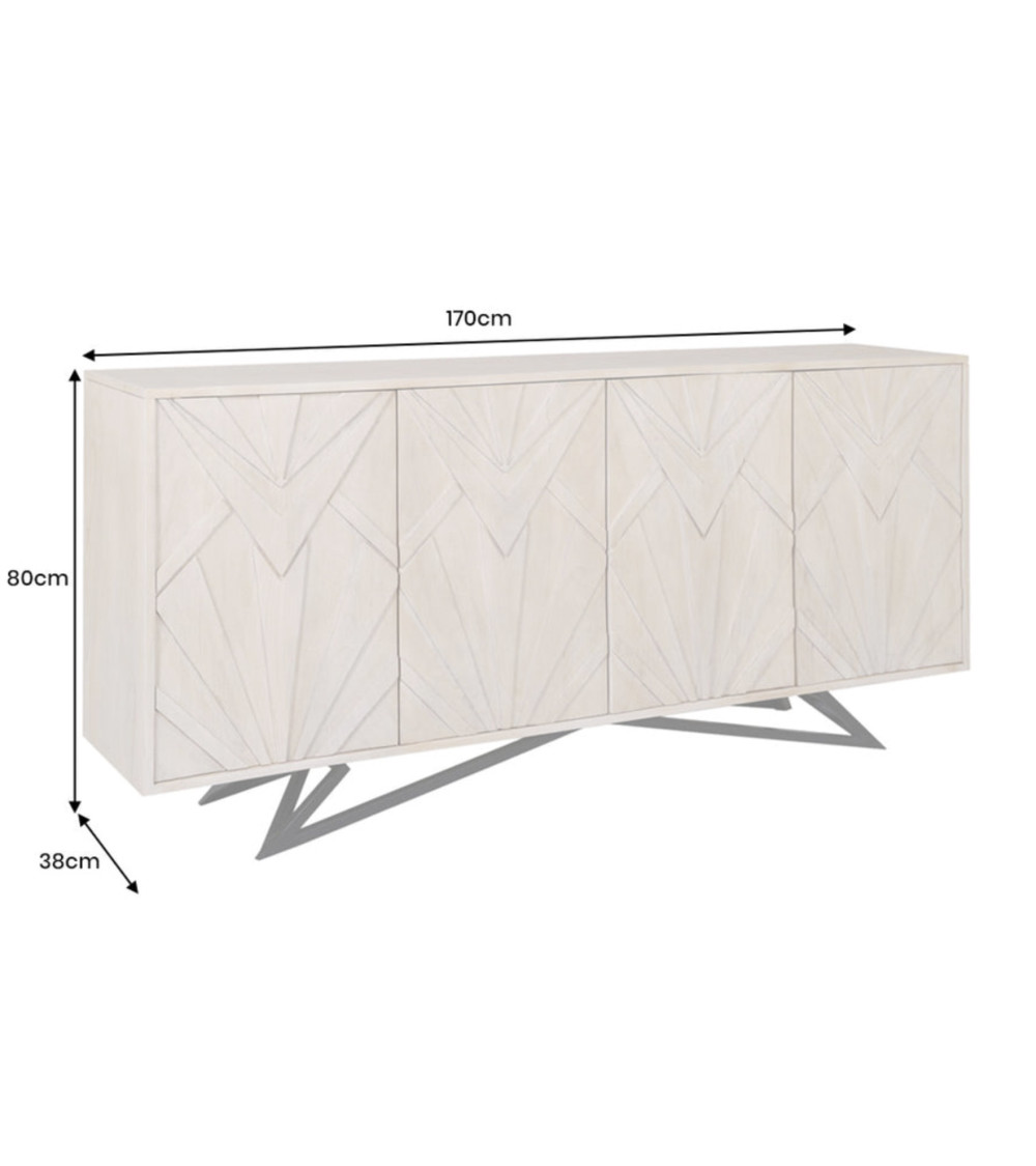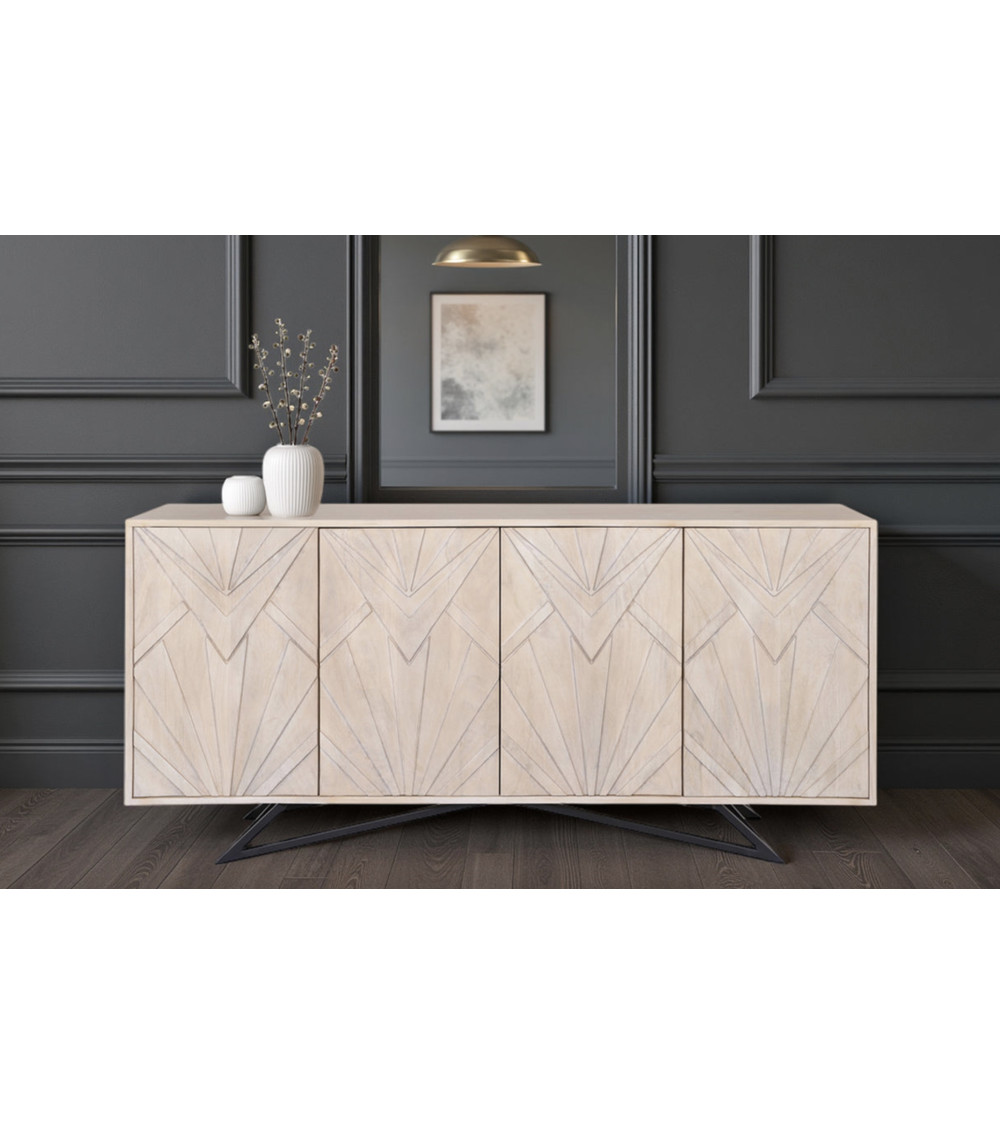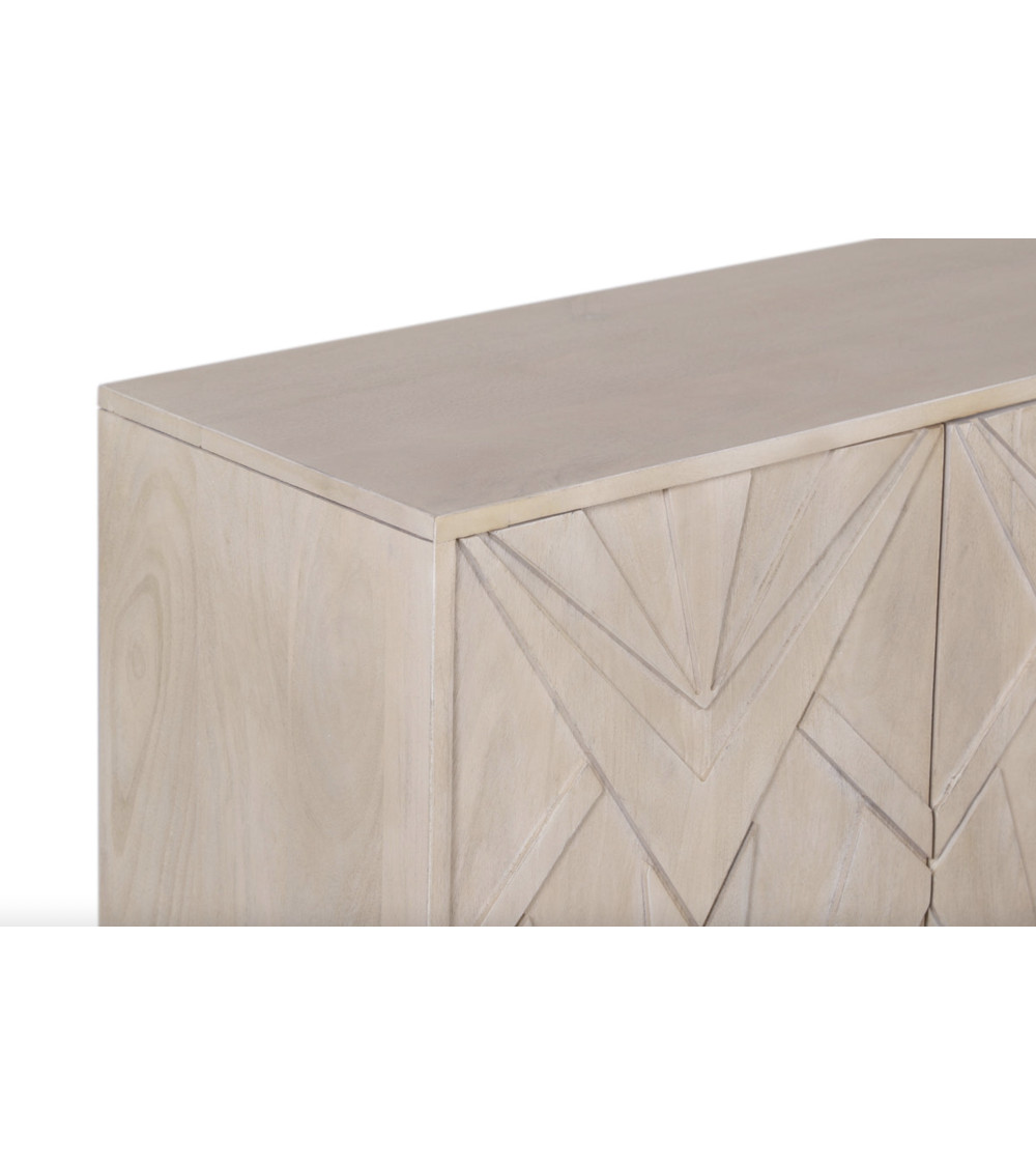 Aporta un toque urbano y artístico a tu hogar con el Aparador METROPOLITAN 170 cm en madera de mango tallada en 3D con acabado white wash: un mueble audaz que combina diseño contemporáneo y encanto artesanal.