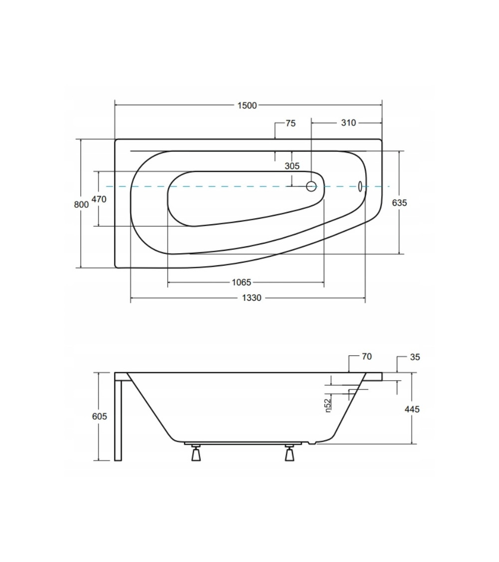 Con su formato angular de 150 cm, la bañera LUNA se adapta incluso a baños pequeños. El acrílico reforzado conserva la temperatura del agua, mientras que el fondo ergonómico abraza el cuerpo para un confort total.