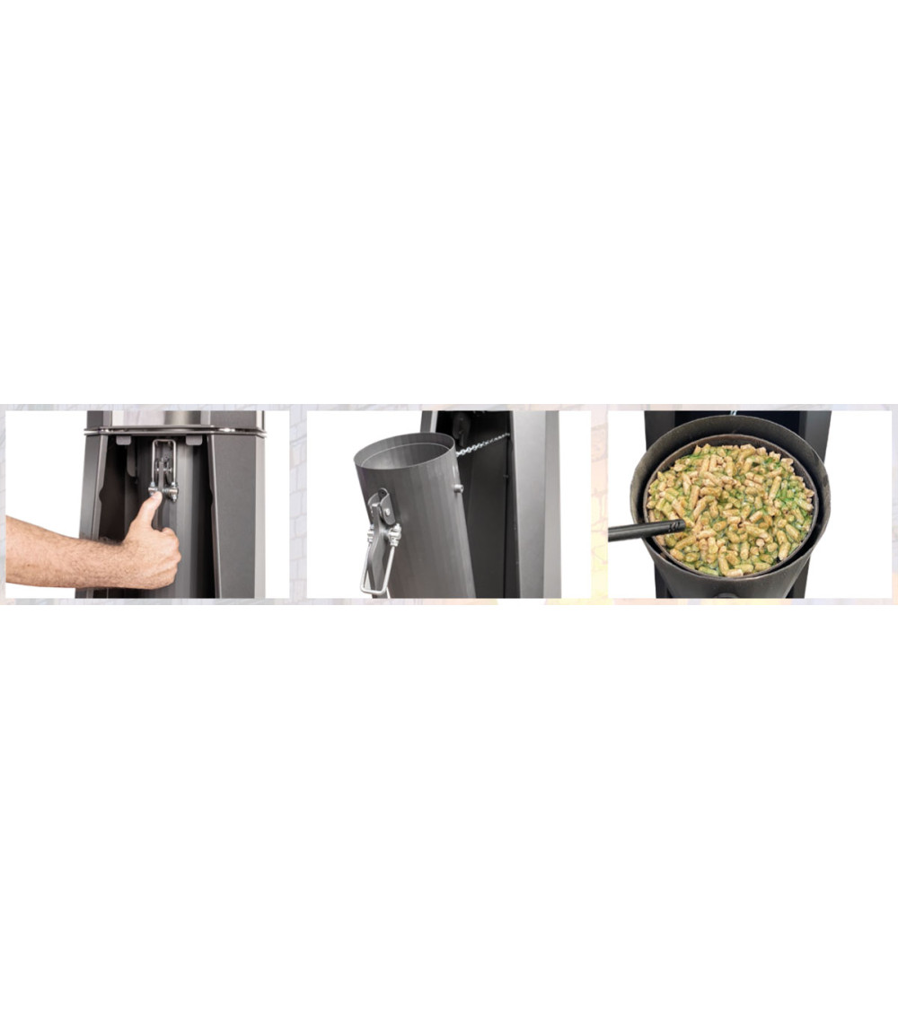 Además, la estufa dispone de una elegante cúpula en la parte superior de la chimenea, de 100 cm de lado. Esta cúpula añade un toque estético al tiempo que ayuda a distribuir el calor uniformemente. Además, confiere a todo el conjunto un aspecto sofisticado, creando un atractivo punto focal para su espacio exterior.
