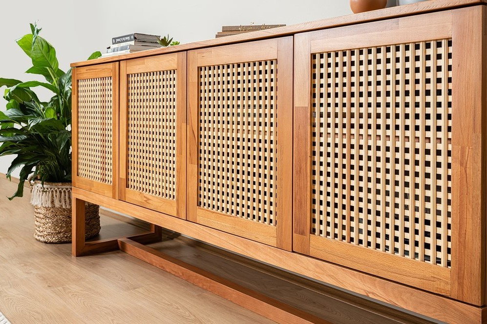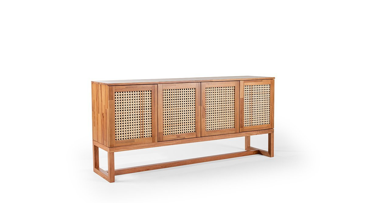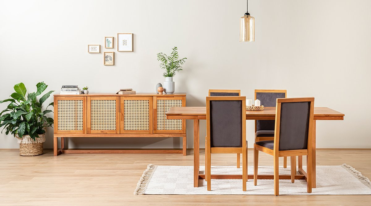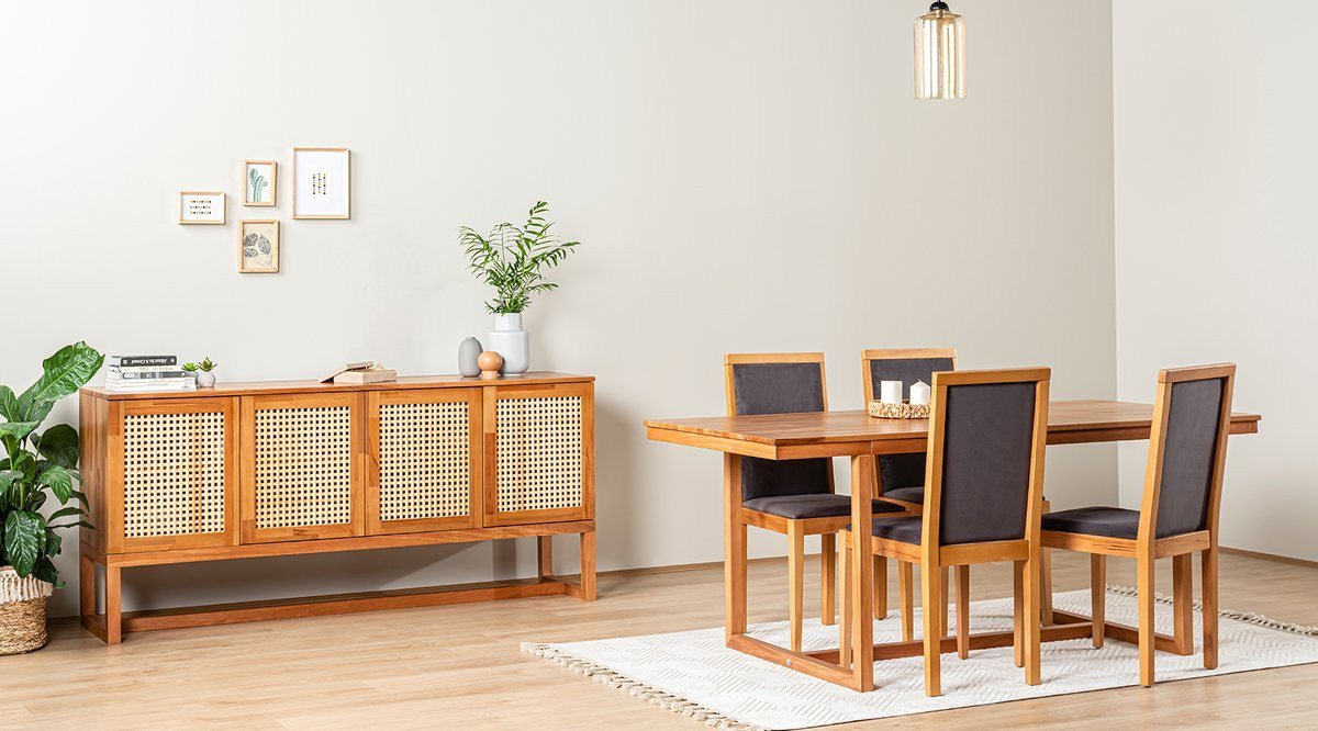 Conjunto de comedor ARDEN compuesto por una mesa rectangular, un aparador de 4 puertas con frentes perforados y cuatro sillas.