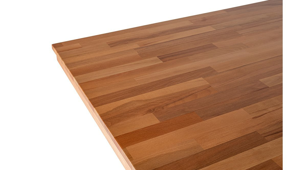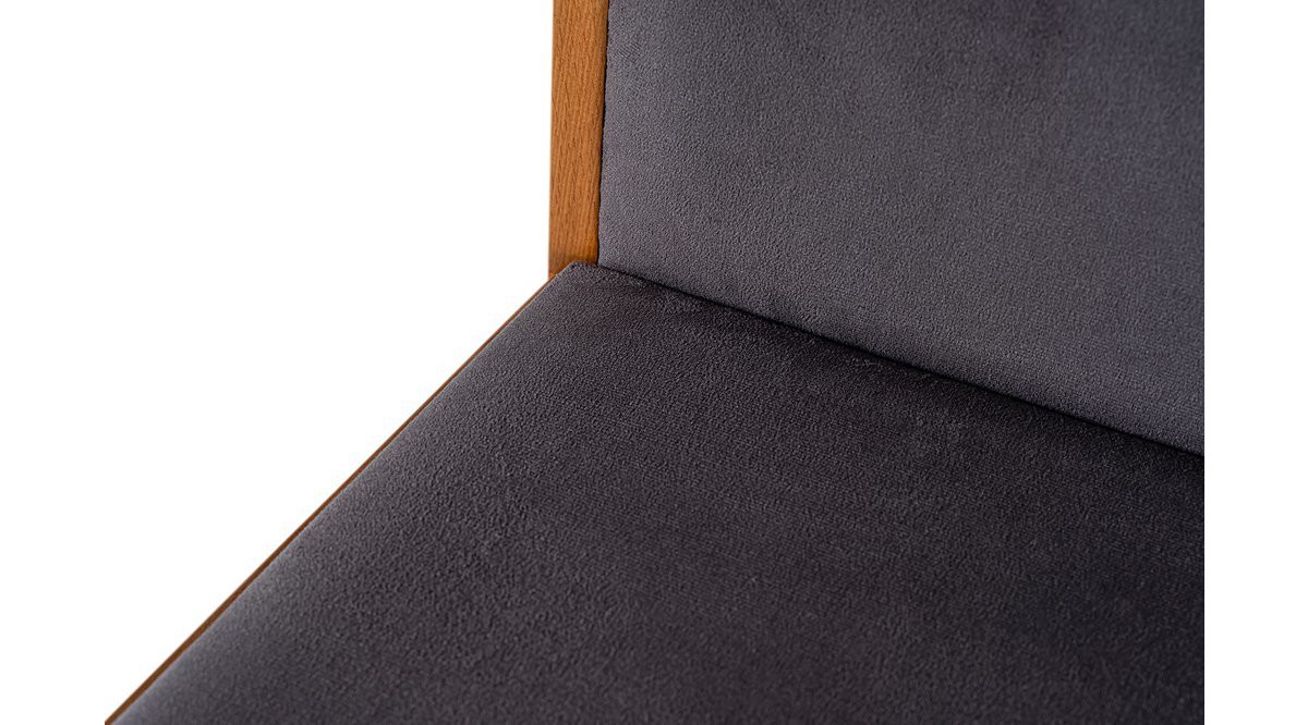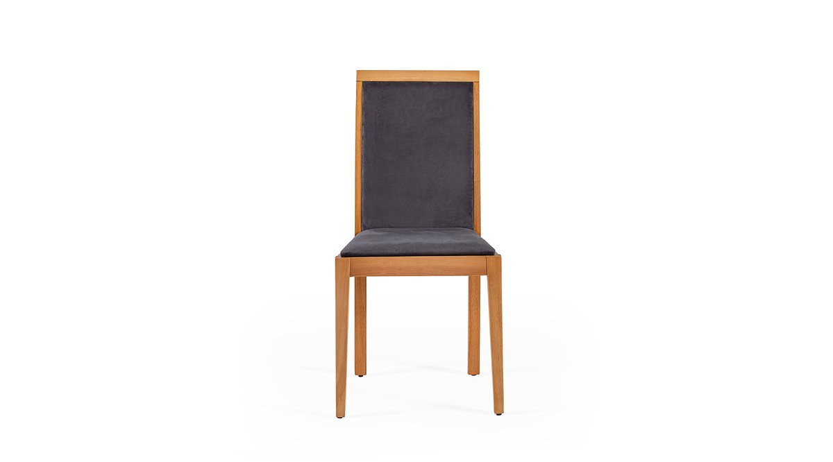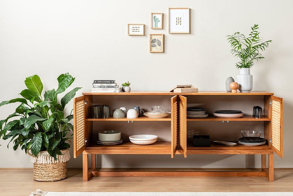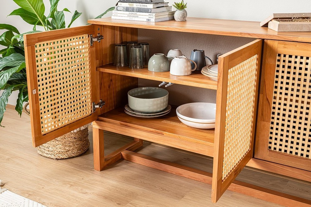 Conjunto de comedor ARDEN compuesto por una mesa rectangular, un aparador de 4 puertas con frentes perforados y cuatro sillas.