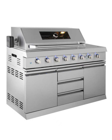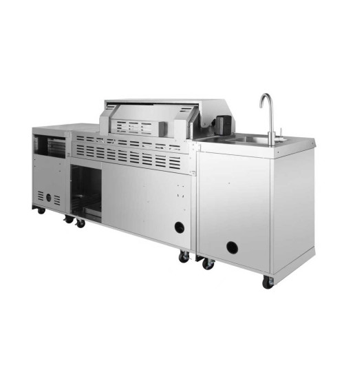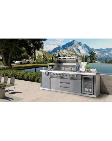 Gracias a su amplia zona de preparación que incluye un fregadero funcional y una parrilla de 6 quemadores potentes, podrás cocinar carnes, verduras, pescados o frutas a la brasa como un auténtico chef.