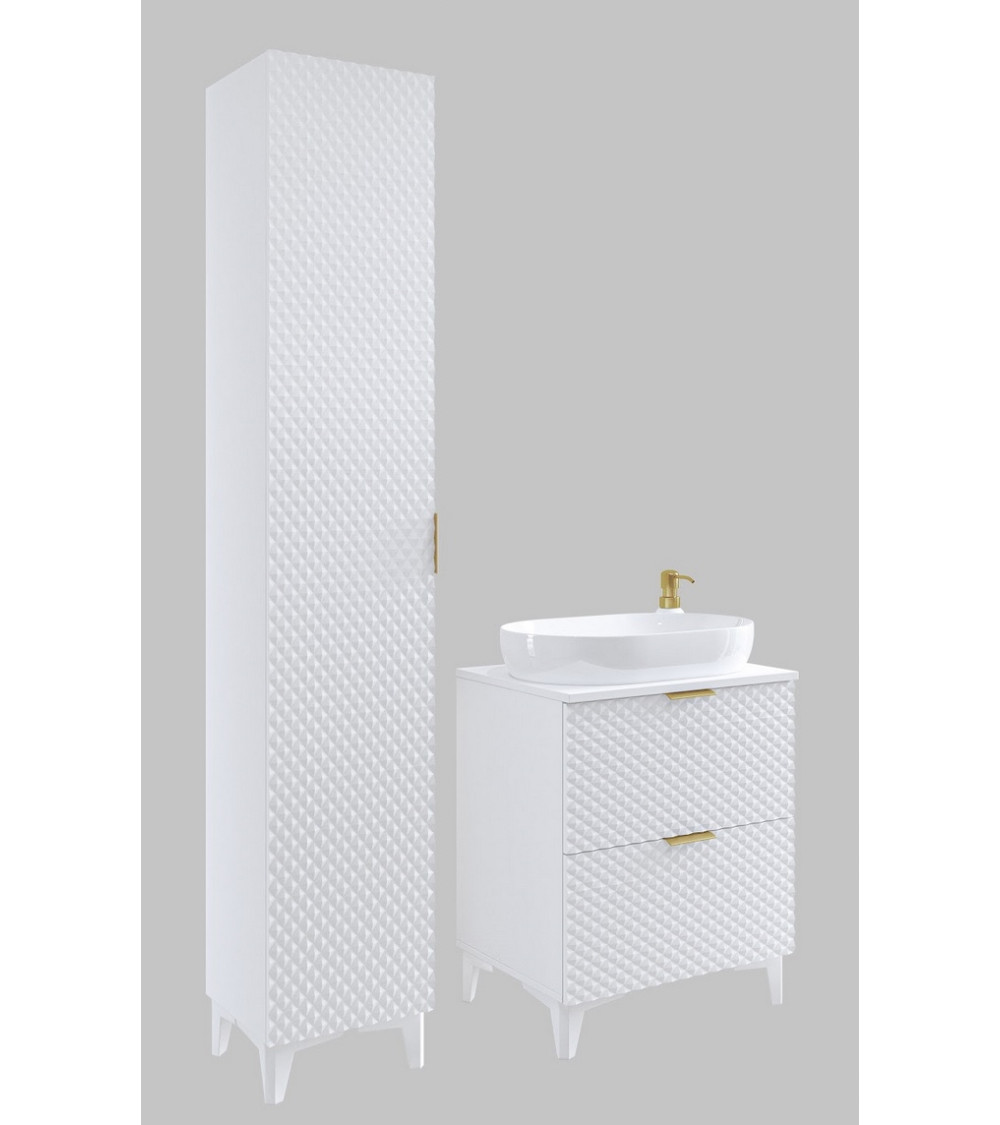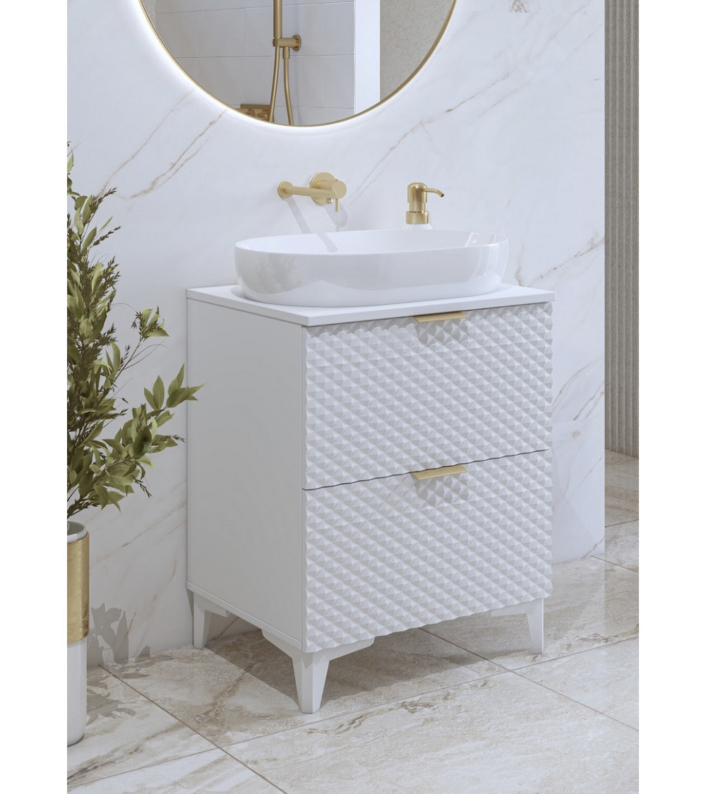 Mejora el estilo de tu baño con el conjunto Laura Blanco 60 cm, un mueble que combina estética y funcionalidad. Gracias a su diseño en relieve geométrico 3D, refleja la luz de forma sofisticada, aportando un aire moderno y decorativo al espacio.