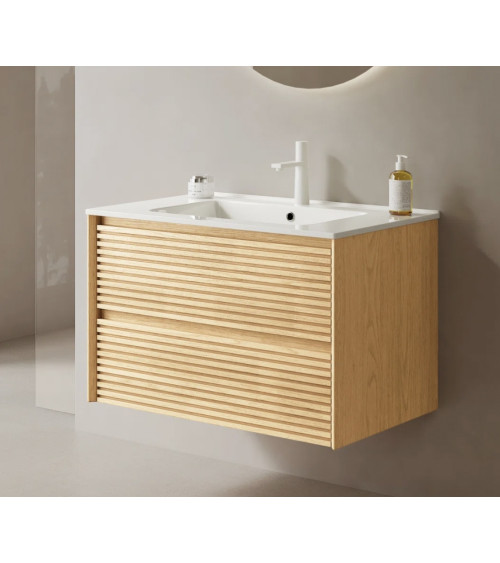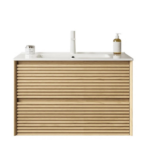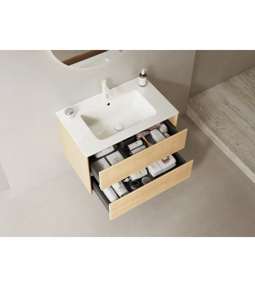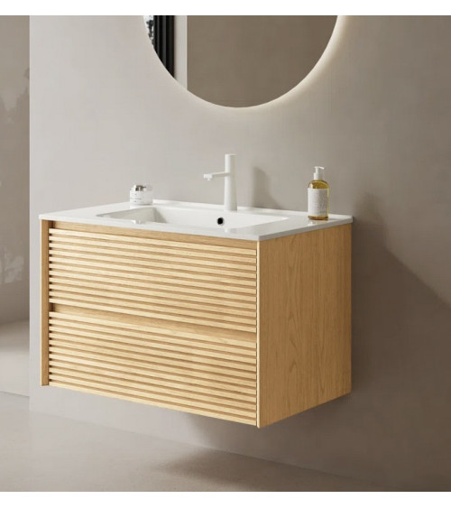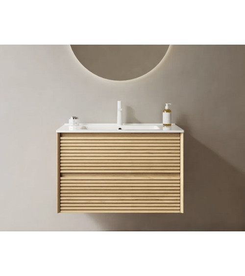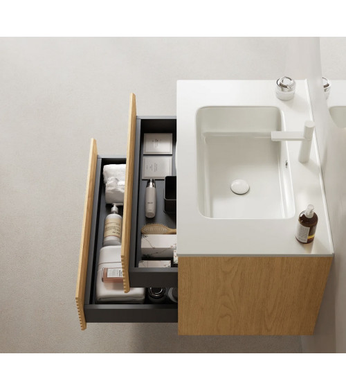 El mueble lavabo Alia ha sido diseñado para responder a las necesidades modernas: optimizar el espacio y, al mismo tiempo, crear un ambiente acogedor. Su lavabo integrado en cerámica de alta calidad facilita la limpieza y garantiza un confort de uso inigualable.