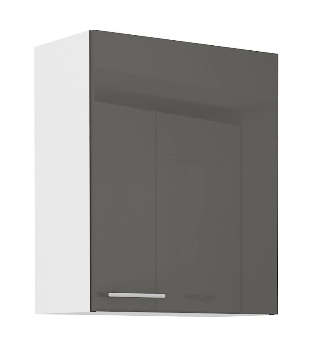 Los frentes en gris brillante y las estructuras blancas mate crean un ambiente moderno, luminoso y sofisticado. Los tiradores cromados refuerzan este estilo con un acabado elegante y profesional.