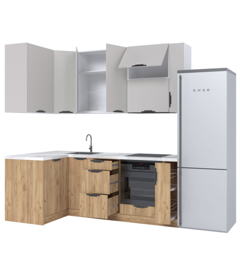 Aporta luminosidad, estilo y funcionalidad a tu hogar con la Cocina Leo en L - 122 x 220 cm - Blanco y roble: una combinación elegante y acogedora que aprovecha cada rincón de tu cocina.