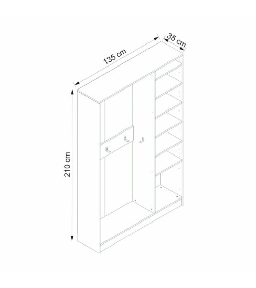 Detrás de dos de las puertas, descubrirá un espacio ingeniosamente diseñado con varios percheros. Estos ganchos proporcionan un lugar práctico para colgar sus abrigos, bolsos y accesorios, asegurando una entrada ordenada y acogedora. La distribución interior ha sido diseñada para maximizar el espacio para colgar, manteniendo tus objetos esenciales al alcance de la mano.