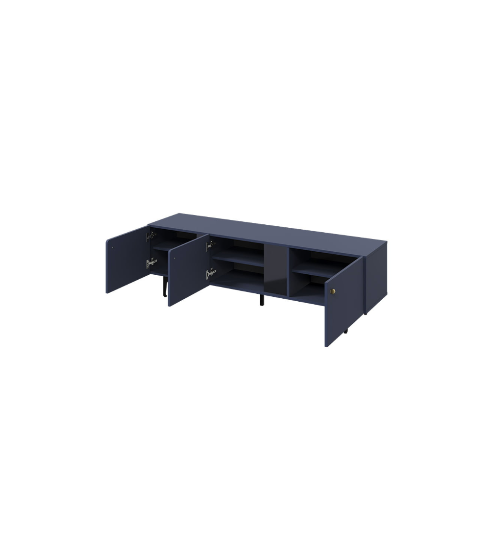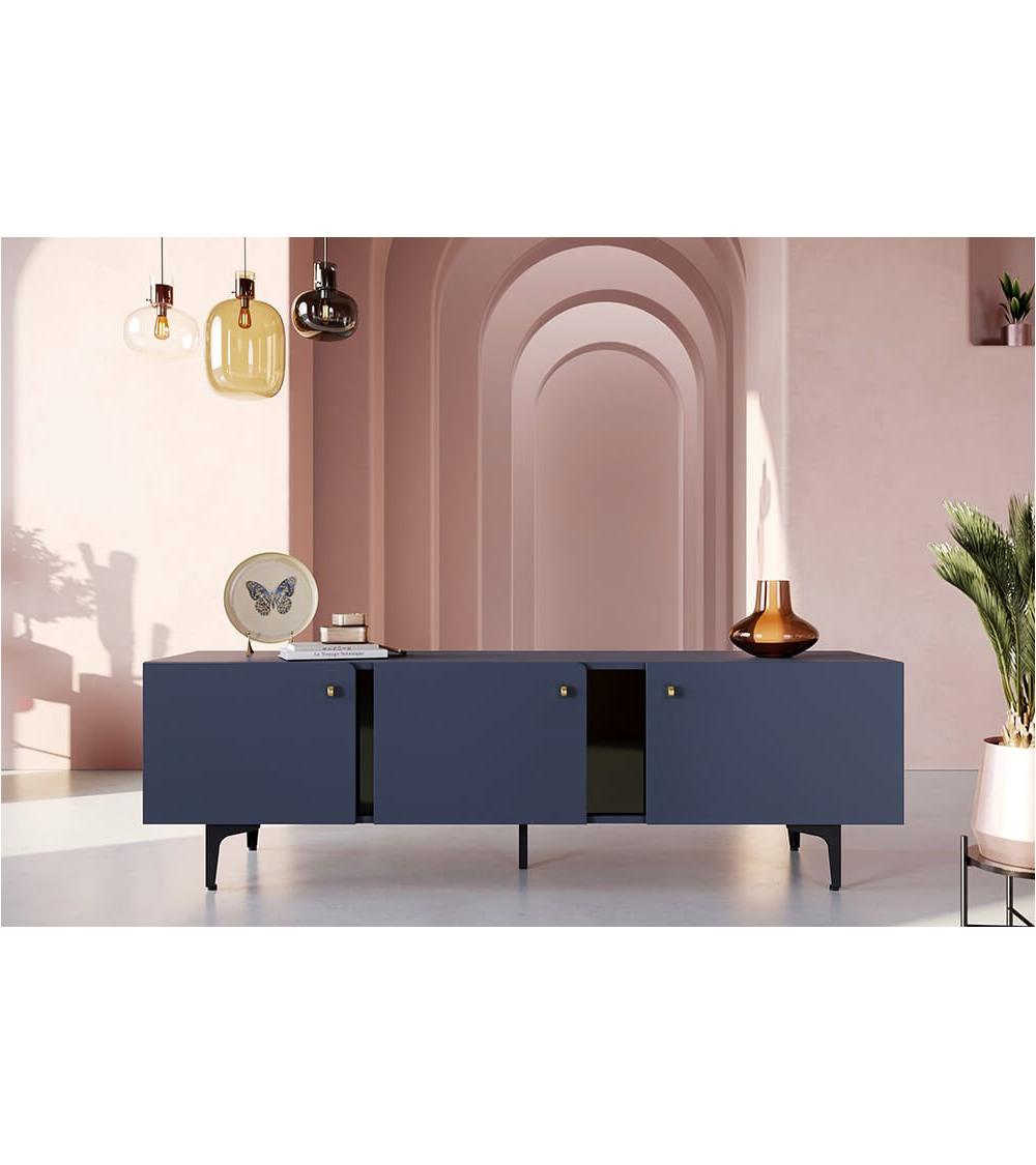 El Mueble TV Colores - 165 cm es la elección perfecta para salones de estilo contemporáneo. Con sus tres puertas, ofrece un espacio de almacenamiento generoso añadiendo un toque de sofisticación gracias a sus detalles dorados y bordes redondeados.