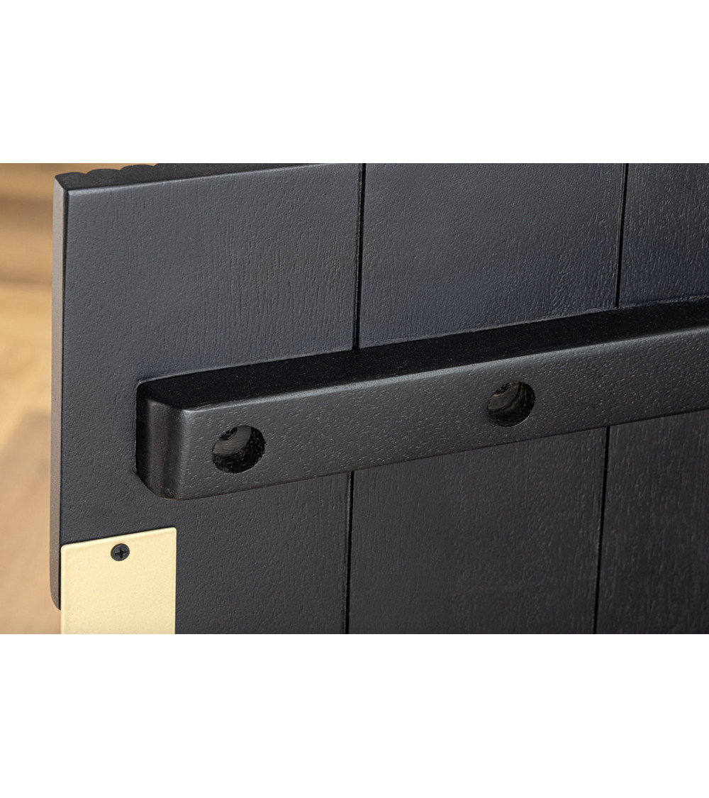 El Mueble TV GATSBY 160 cm es la unión perfecta entre diseño vintage y comodidad contemporánea. La madera de mango negra barnizada, realzada con detalles dorados, aporta carácter inmediato al espacio y crea un ambiente sofisticado.