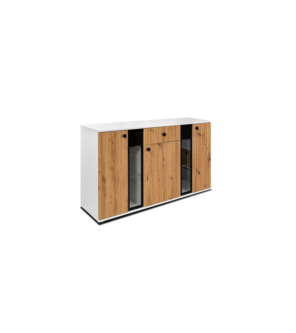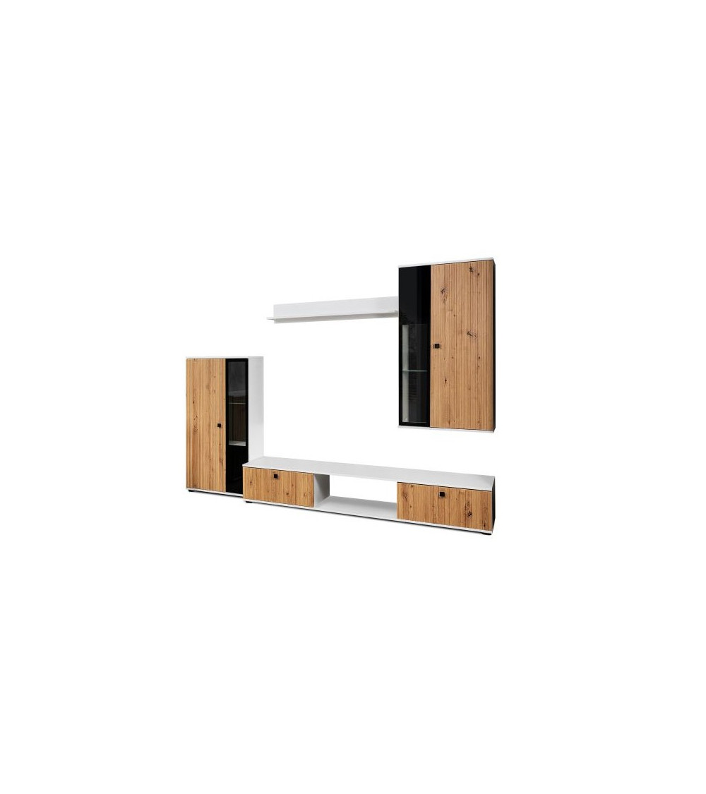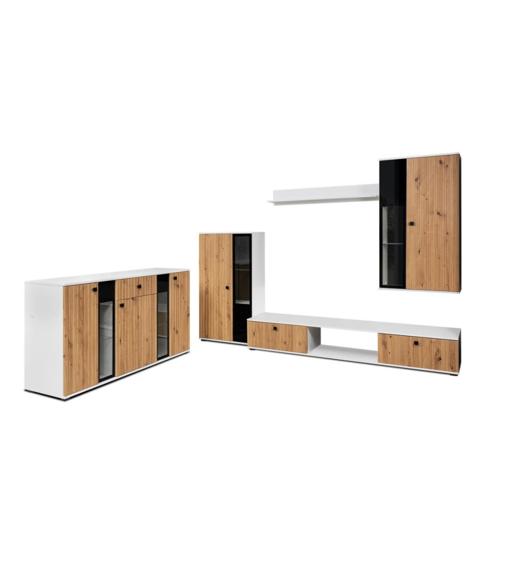 Este salón completo CALI combina elegancia contemporánea y funcionalidad práctica para transformar su espacio de entretenimiento. Este conjunto aporta un toque moderno a su salón conservando una estética cálida gracias a sus colores roble, negro y blanco.