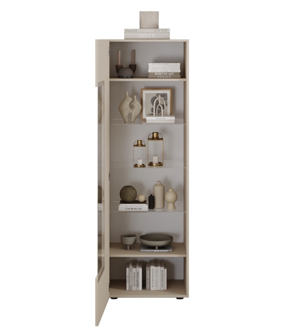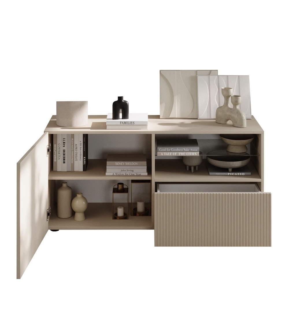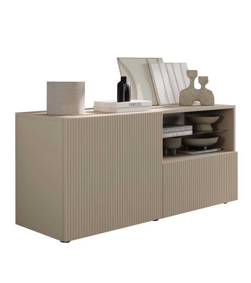 ¿Buscas una solución completa para amueblar tu salón? El Conjunto Rio Cashmere incluye tres muebles combinados: mueble TV bajo, aparador con puertas y cajones y una vitrina con puerta de cristal. El resultado es un espacio armónico que combina estética y funcionalidad.