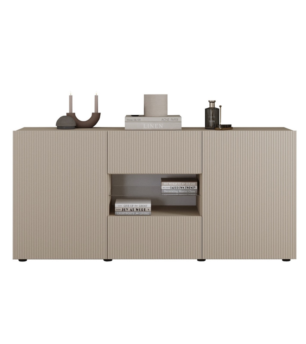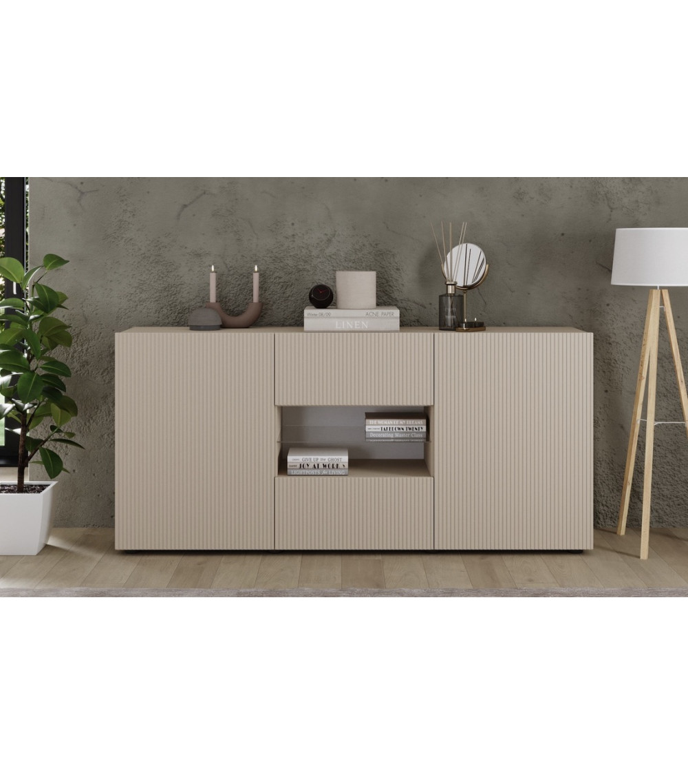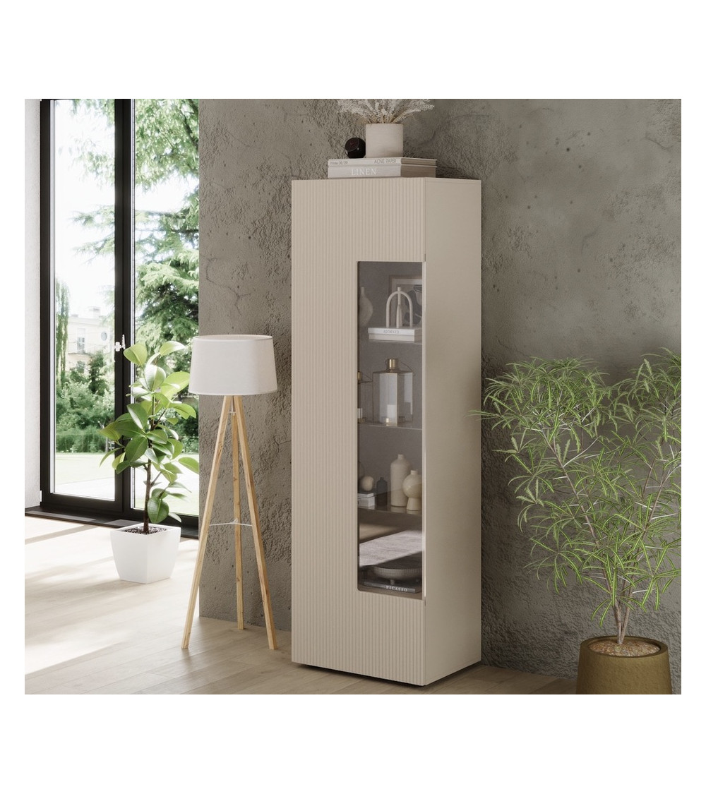 ¿Buscas una solución completa para amueblar tu salón? El Conjunto Rio Cashmere incluye tres muebles combinados: mueble TV bajo, aparador con puertas y cajones y una vitrina con puerta de cristal. El resultado es un espacio armónico que combina estética y funcionalidad.