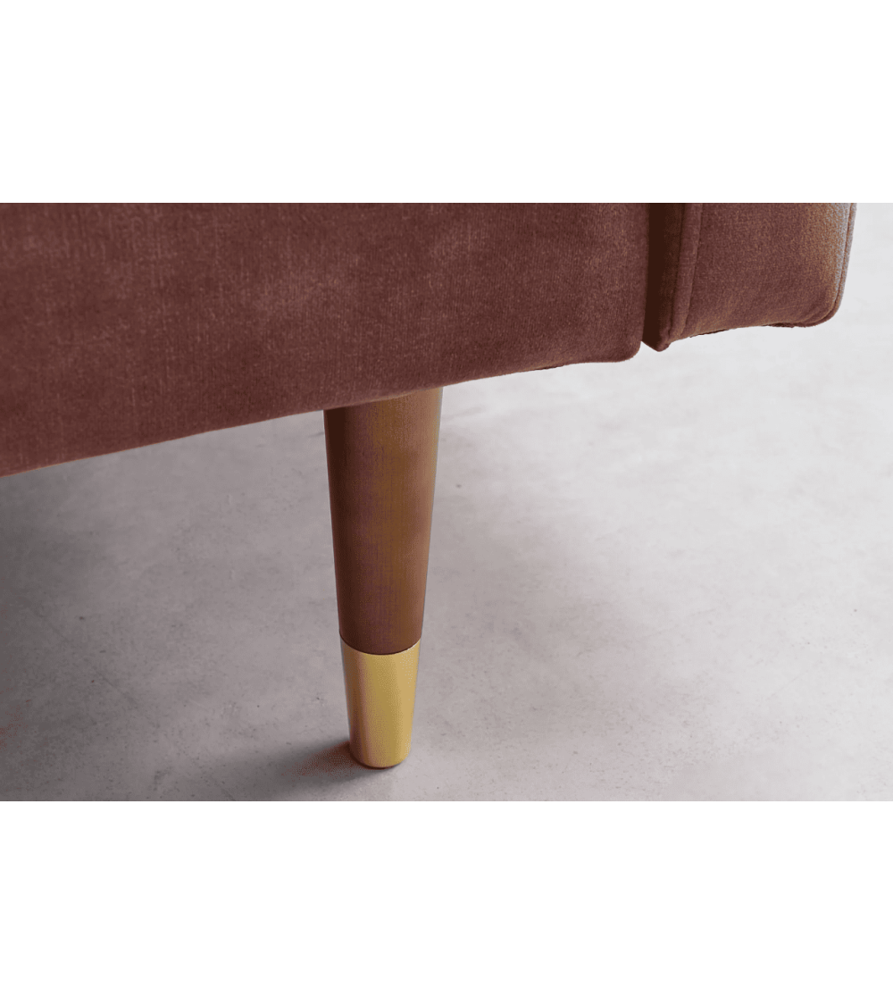 El tapizado es de microterciopelo de alta calidad, con patas de madera de abedul y detalles metálicos dorados.