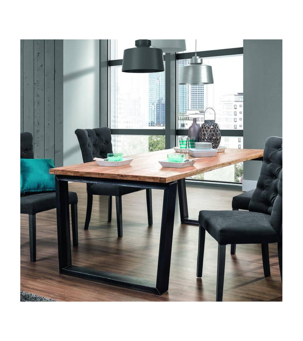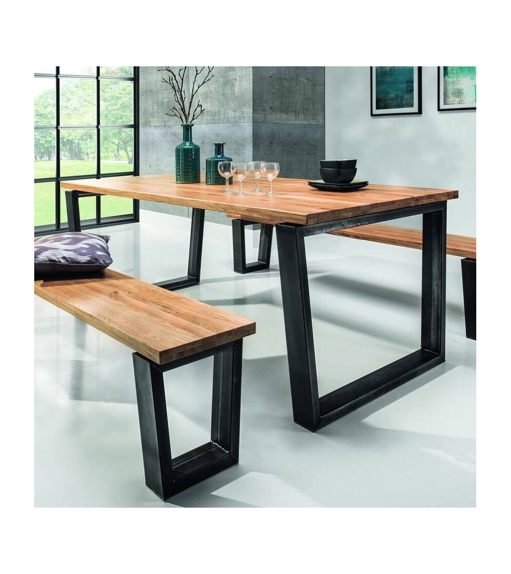 Massiivitammipöytä, jossa on nykyaikainen muotoilu ja harvinaista eleganssia sen vastakkaisten materiaalien ansiosta: paksu, korkealaatuinen massiivitammipinta, jonka viimeistely on puusepän työn arvoinen, lepää vakaan metallirungon päällä, leveä ja rauhoittava jalusta, jonka muotoilua ei kuitenkaan ole jätetty sattuman varaan.
