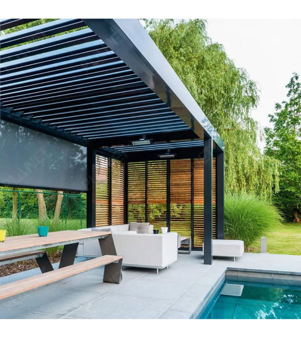 La structure réunit trois modules assemblés : deux modules de 2 m × 3 m encadrant un module central de 4 m × 3 m, offrant ainsi trois zones de réglage indépendantes des lames motorisées. Un store manuel de 4 m, intégré sur la façade, complète la protection solaire ou visuelle. Les claustras latéraux en aluminium finition bois naturel confèrent la chaleur du bois sans l’entretien, tandis que la structure noire sublime le design contemporain.
