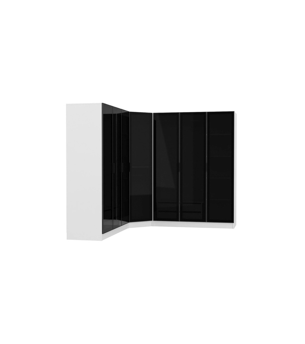 Cette armoire d'angle est très fonctionnelle. Elle possède 7 portes, ce qui permet de disposer d'un grand espace de rangement. Sa forme et sa hauteur la rendent discrète malgré sa grande taille.