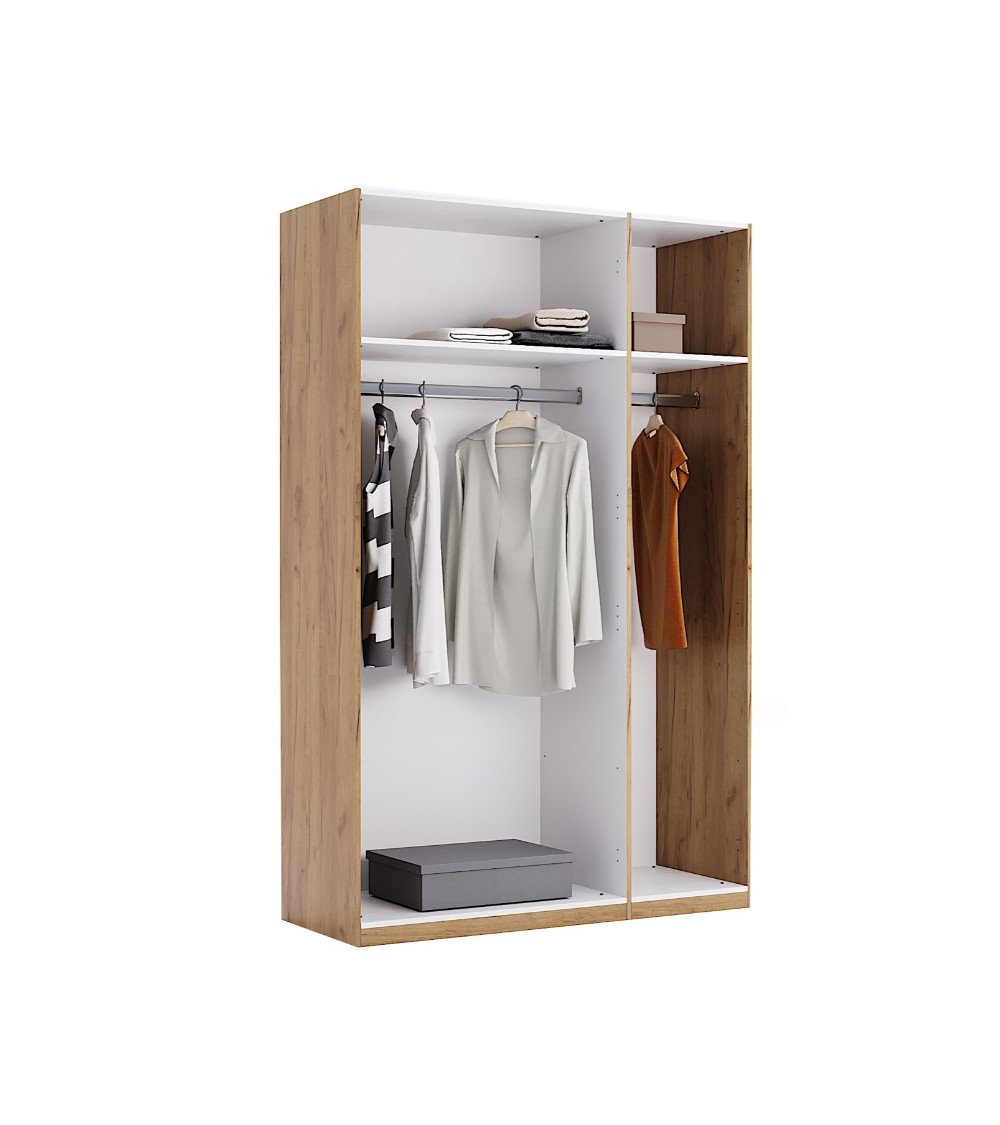 L'armoire est équipée d'une disposition intelligente à l'intérieur, comprenant deux espaces penderies et 2 étagères en hauteur, offrant ainsi une solution de rangement pour vos vêtements, accessoires et autres effets personnels. Les poignées discrètes sur les portes ajoutent une touche de minimalisme tout en assurant une prise en main pratique.