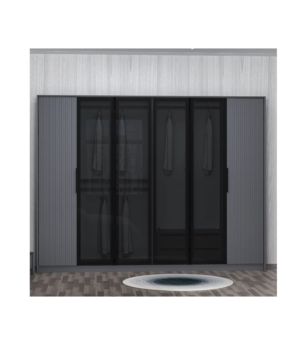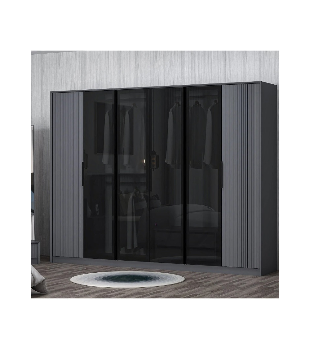 Quatre des six portes sont délicatement réalisées en verre teinté, ajoutant une dimension visuelle unique à l'armoire. Le verre teinté offre une subtile translucidité, permettant de deviner le contenu tout en apportant une touche d'élégance et de modernité à l'ensemble.