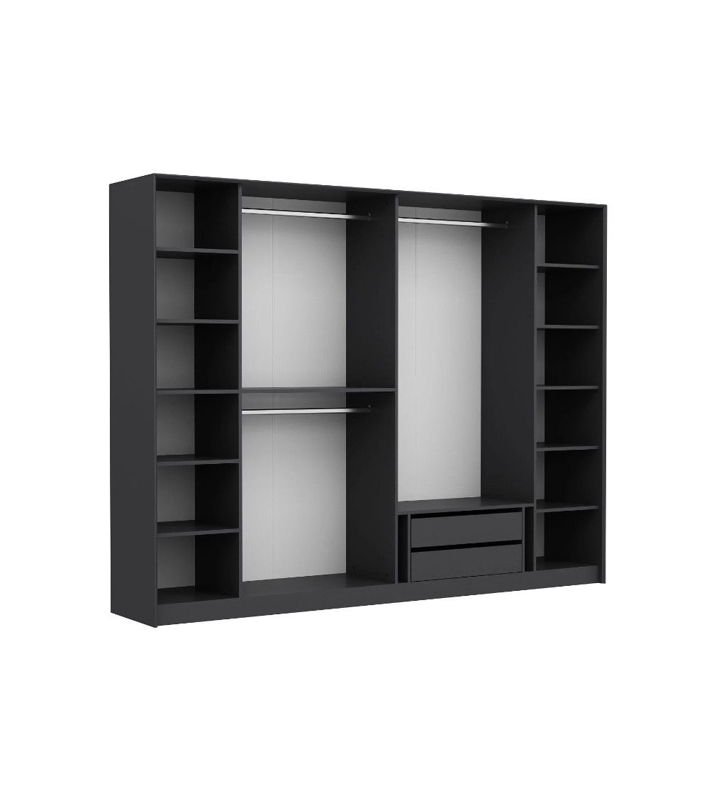 De chaque côté de l'armoire, une colonne d'étagères verticales offre un espace généreux pour le rangement organisé de vos articles pliés. Ces sections sont parfaitement adaptée pour les pulls, serviettes, literie ou tout autre objet nécessitant un espace de stockage soigné et accessible.