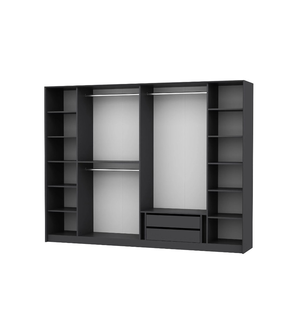 L'armoire présente une finition anthracite, conférant à la pièce une allure moderne et chic. Cette couleur profonde et élégante apporte une touche d'audace tout en conservant une élégance intemporelle, s'intégrant harmonieusement à divers styles d'intérieurs contemporains.