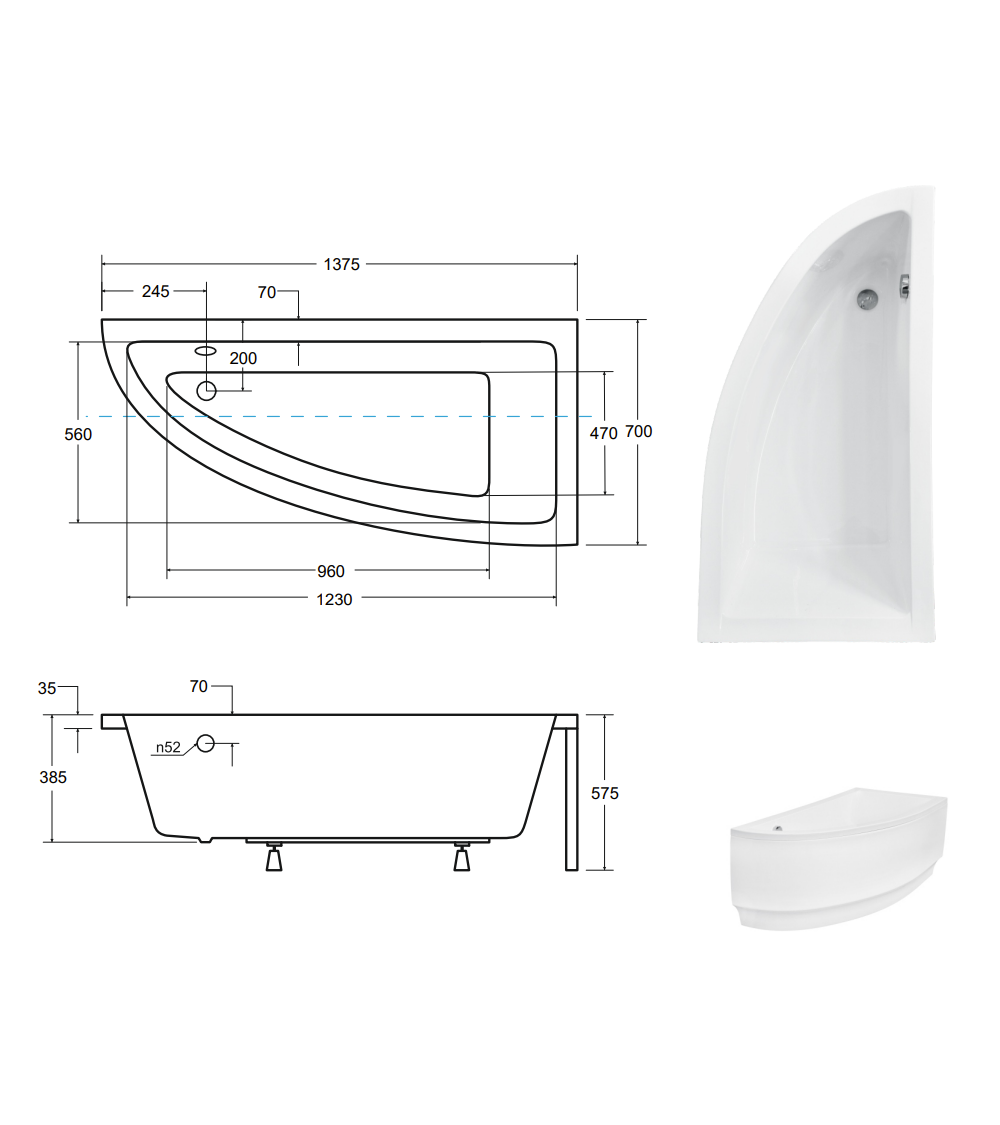 | Produit | Baignoire d’angle ORIEGO II 140 cm droite — SANS tablier |