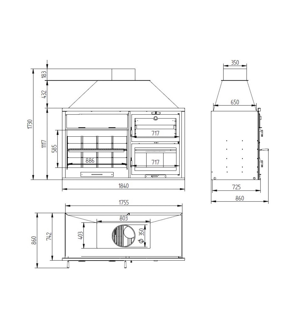 | Sortie de fumée | Mâle Ø 350 mm avec hotte |