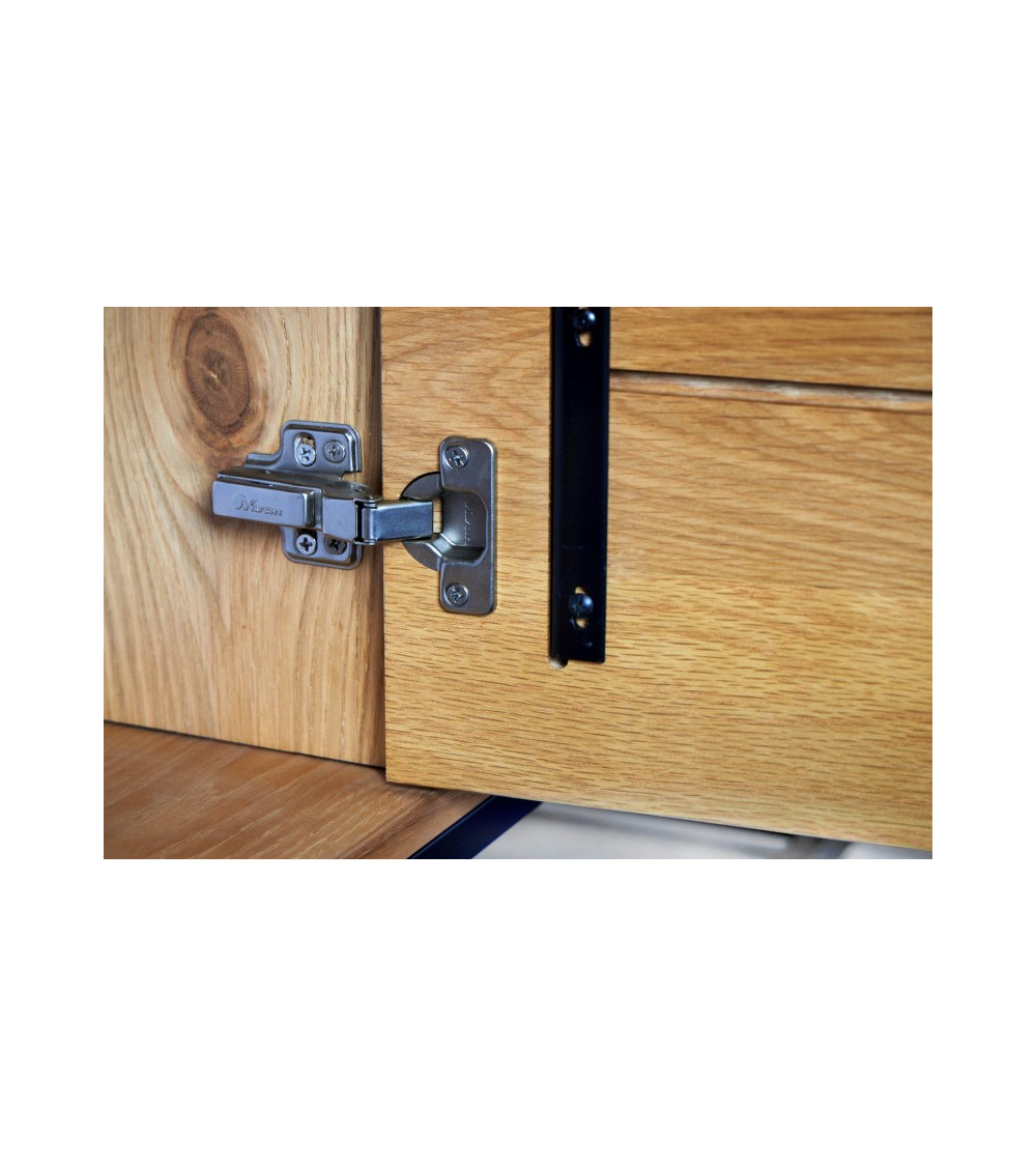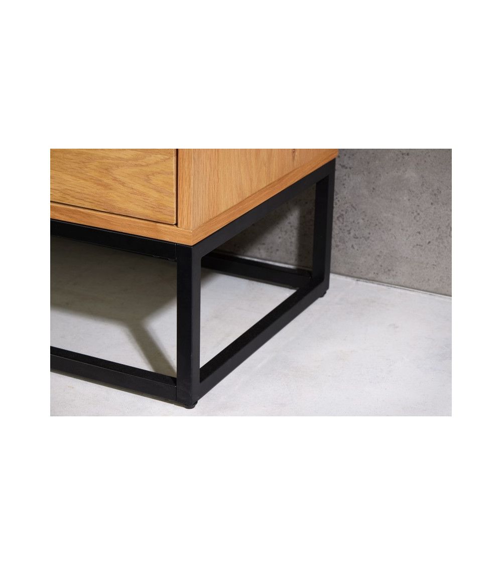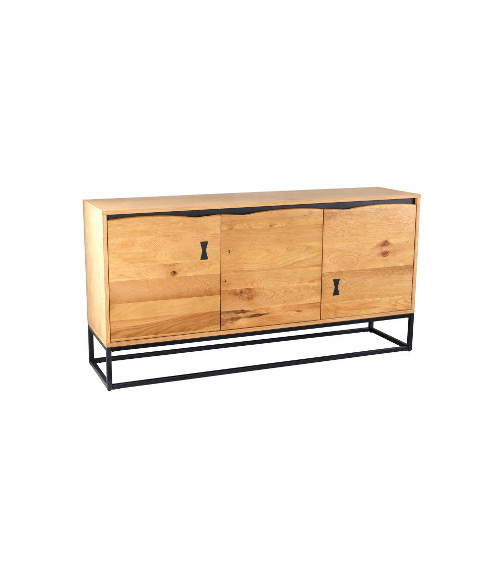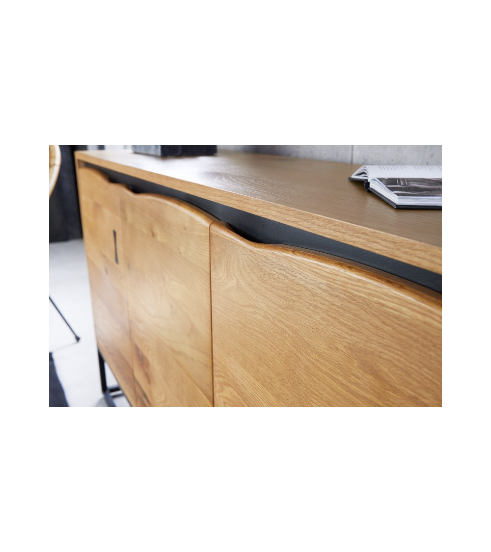 Le buffet mesure environ 150 cm de largeur, 80 cm de hauteur et 40 cm de profondeur, avec une charge maximale de 75 kg. Le cadre mesure 2 cm de largeur sur 2 cm de profondeur, assurant stabilité et robustesse. Le corps du buffet est fabriqué en placage de chêne, apportant une finition naturelle et chaleureuse. Le cadre en fer enduit de poudre est de couleur noire, créant un contraste élégant avec la bordure noire du corps.