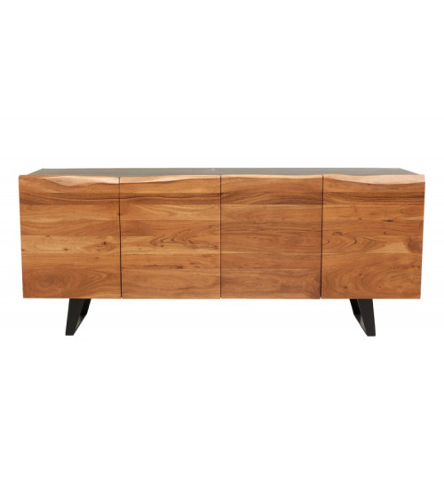 Le corps et les façades du buffet sont fabriqués en MDF avec un placage en bois d'acacia, mettant en valeur la beauté naturelle du bois. Le cadre en fer enduit de poudre ajoute une touche industrielle et assure la stabilité du meuble. Les portes sont équipées de fermetures magnétiques pour une utilisation facile et sécurisée.