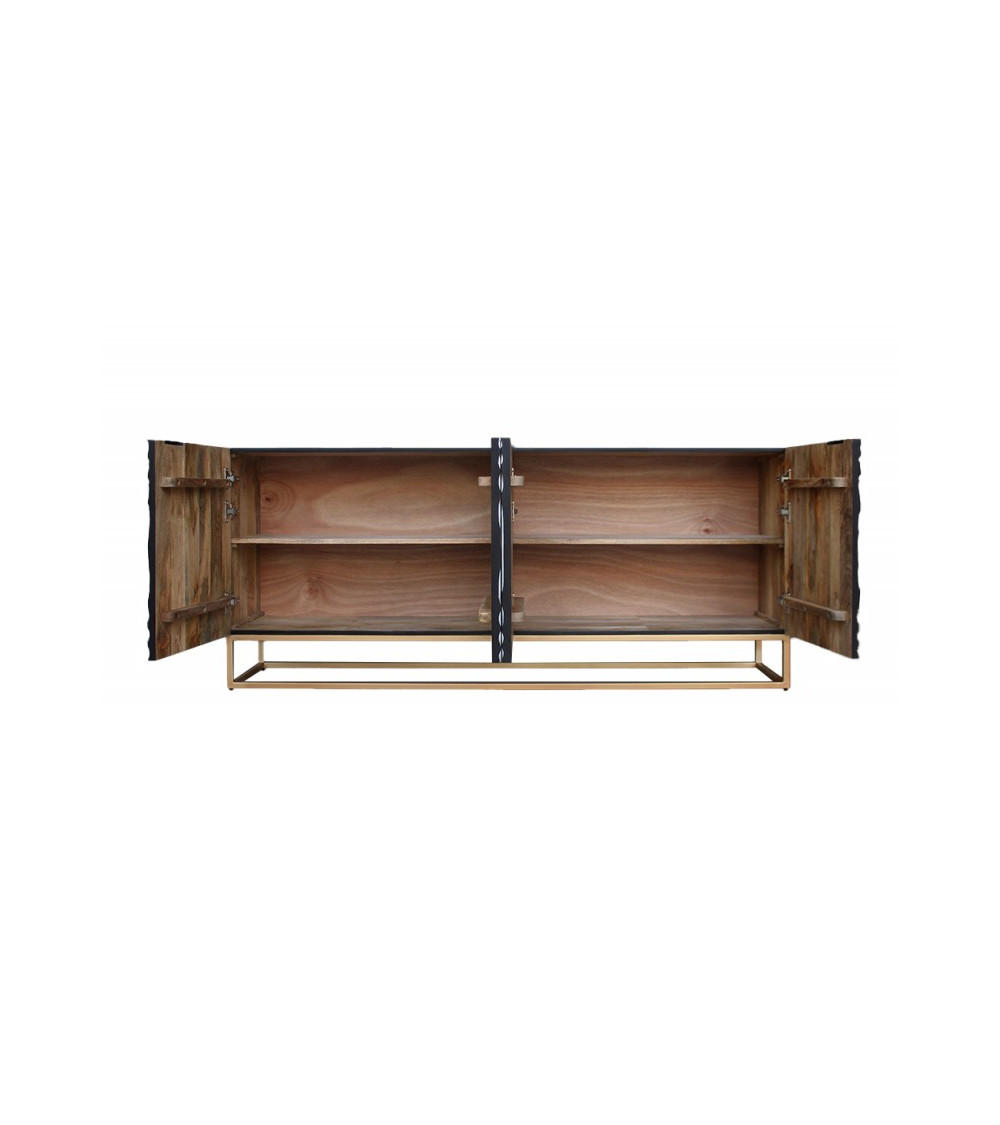 Le cadre du buffet est fabriqué en fer enduit de poudre, avec une finition dorée qui ajoute une touche de luxe et de sophistication à l'ensemble. Cette combinaison de matériaux et de couleurs crée un contraste visuel captivant, mettant en évidence l'artisanat minutieux de la surface en optique 3D.