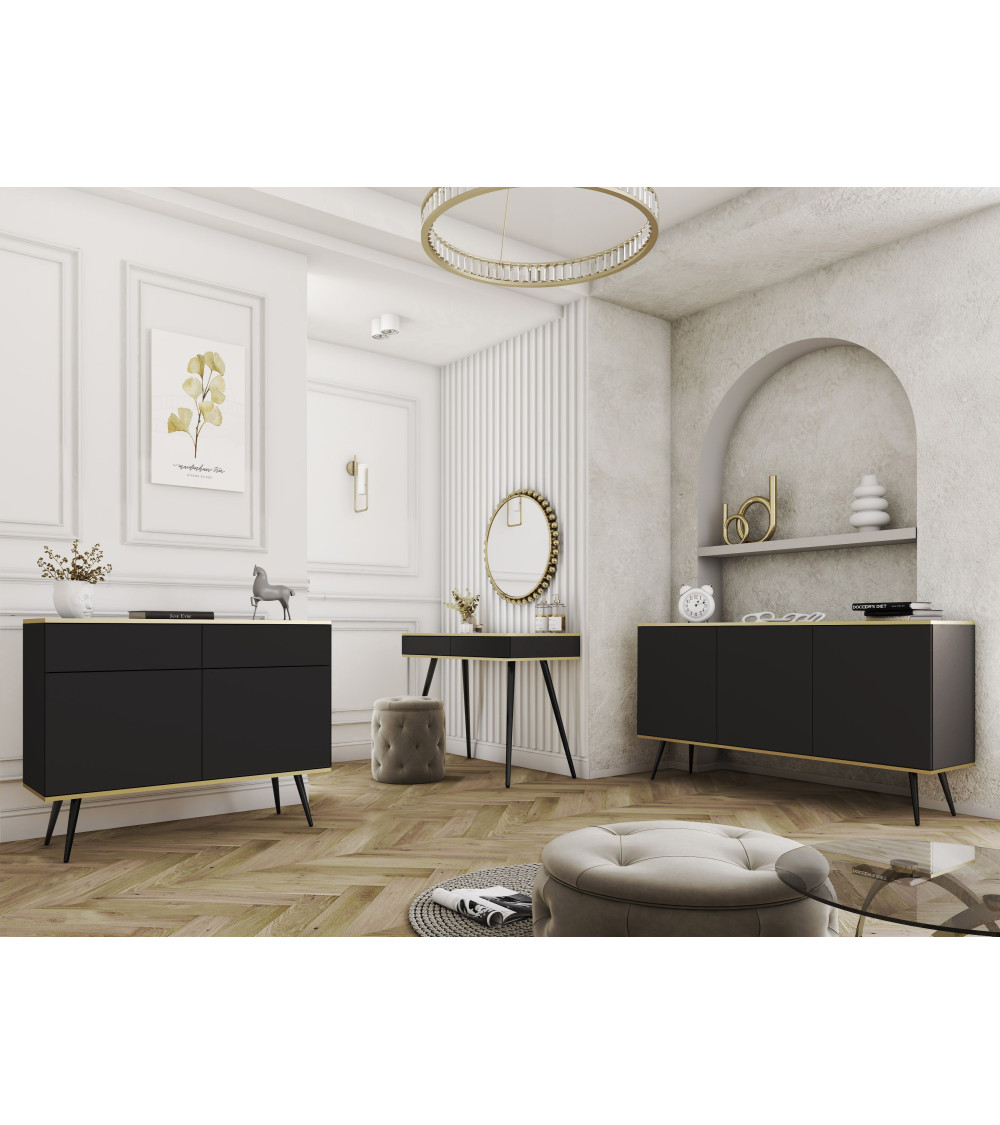 Le Buffet ORO 160 cm est bien plus qu'un simple meuble de rangement. Avec son design contemporain et ses pieds dorés, il apporte une touche de sophistication à tout intérieur. Fabriqué avec des matériaux de haute qualité, comme des panneaux stratifiés de 16 mm et des bords ABS, ce buffet est conçu pour durer.