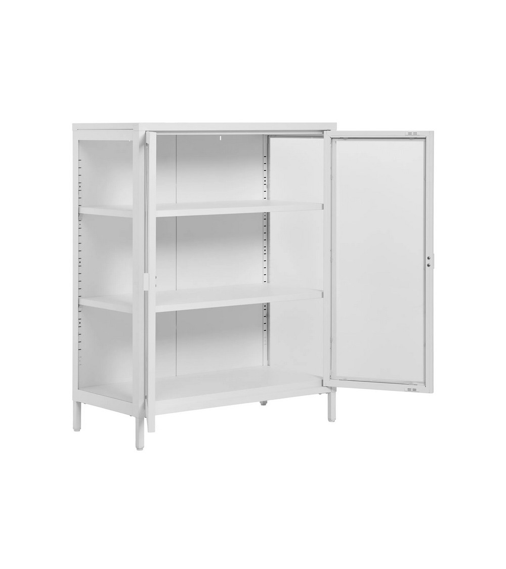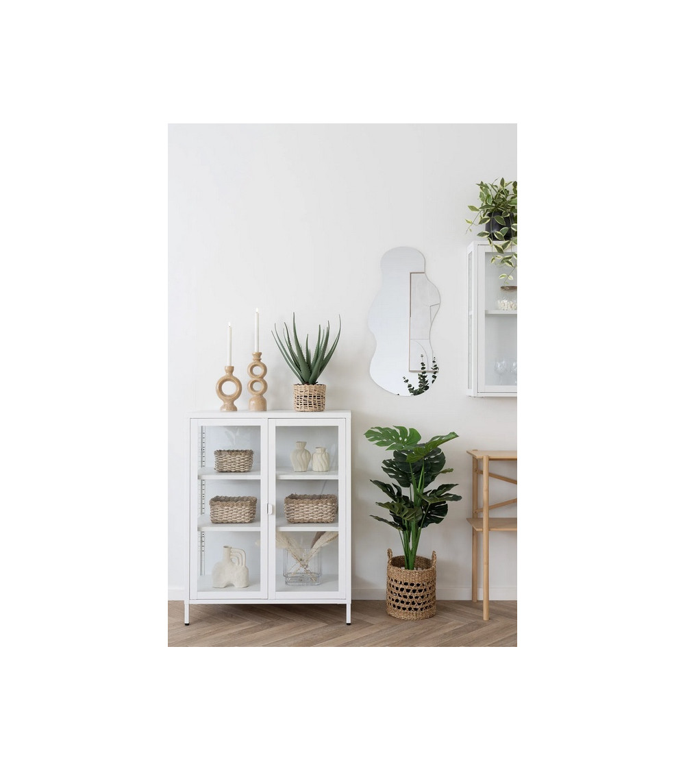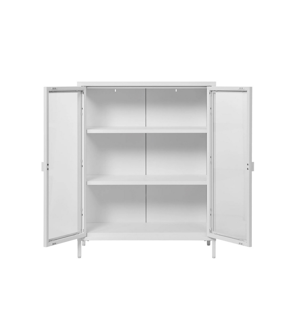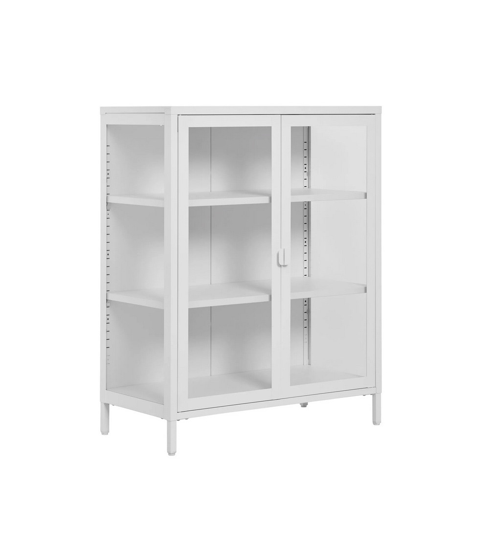 Le Rangement Brisbane est conçu pour exposer avec style votre vaisselle, vos objets décoratifs ou vos livres tout en les protégeant grâce à ses portes en verre transparent. Son design épuré et sa structure en acier blanc s'intègrent parfaitement dans tout intérieur moderne.