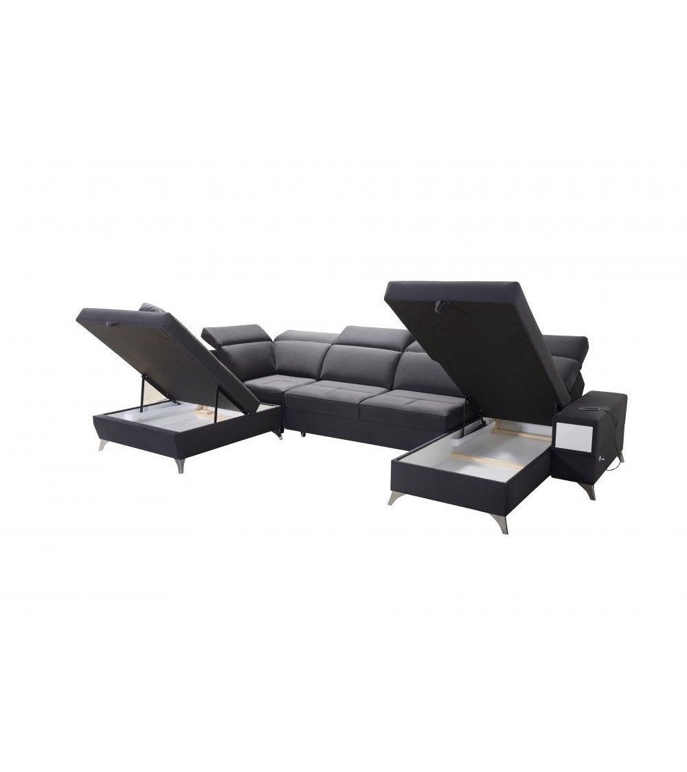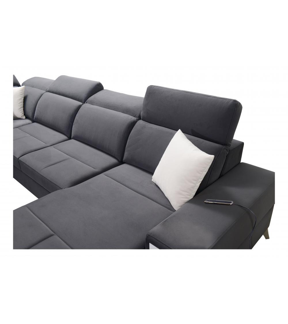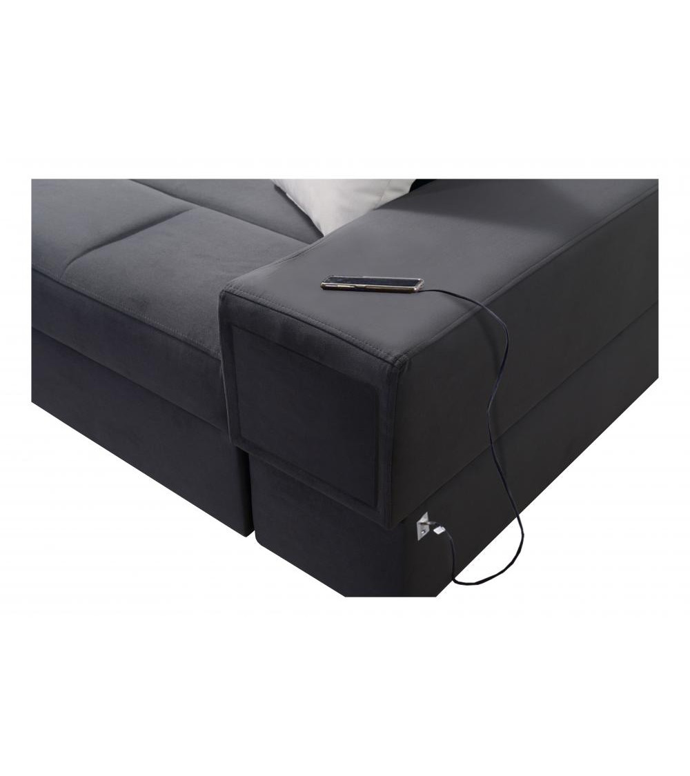 Ses plus ? Il est convertible, il possède un grand coffre de rangement, un tiroir dans l'accoudoir, des porte-verres et des ports USB pour pouvoir charger votre téléphone.