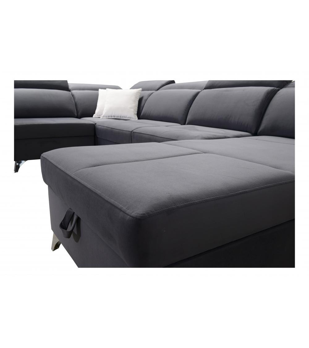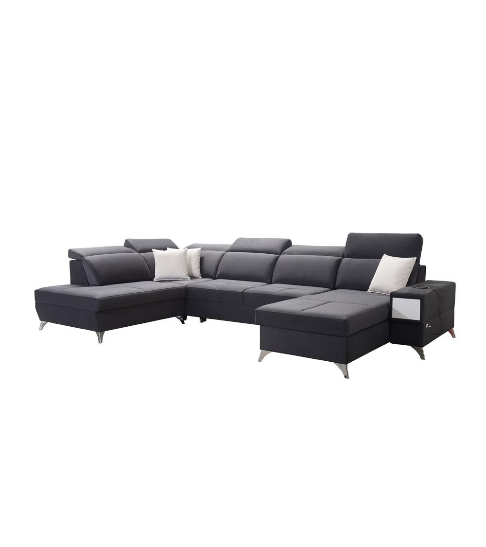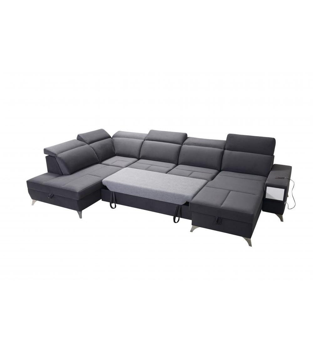 Ses plus ? Il est convertible, il possède un grand coffre de rangement, un tiroir dans l'accoudoir, des porte-verres et des ports USB pour pouvoir charger votre téléphone.