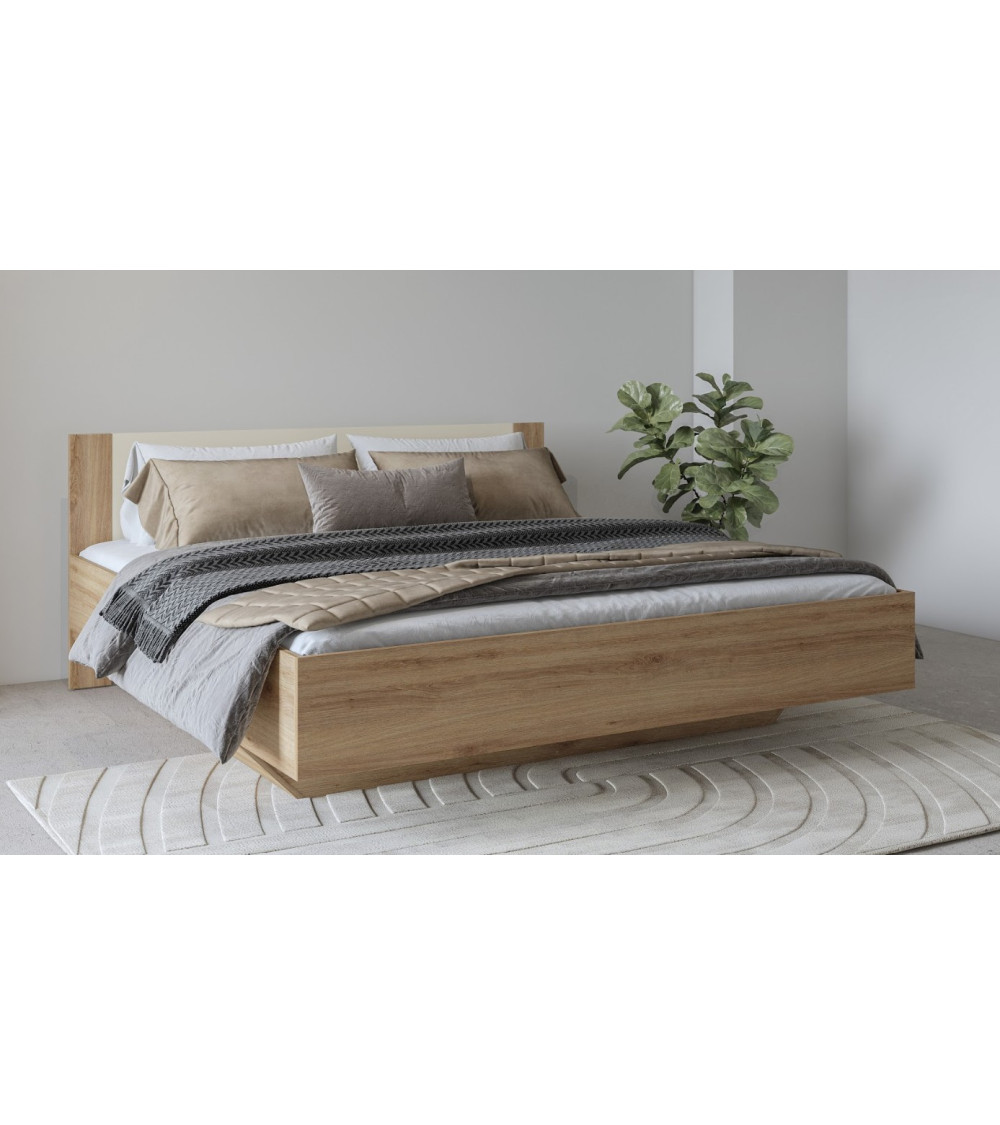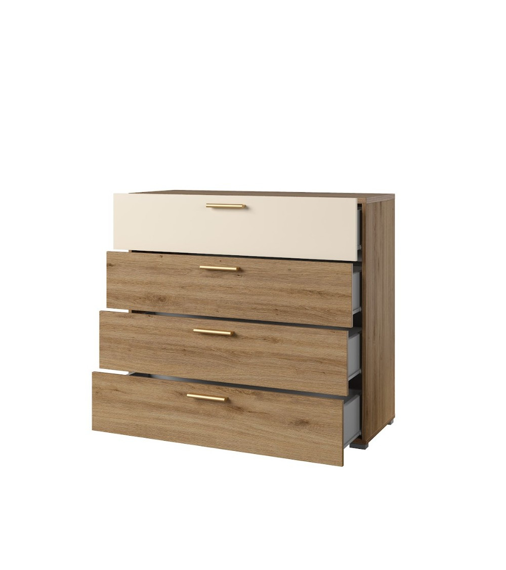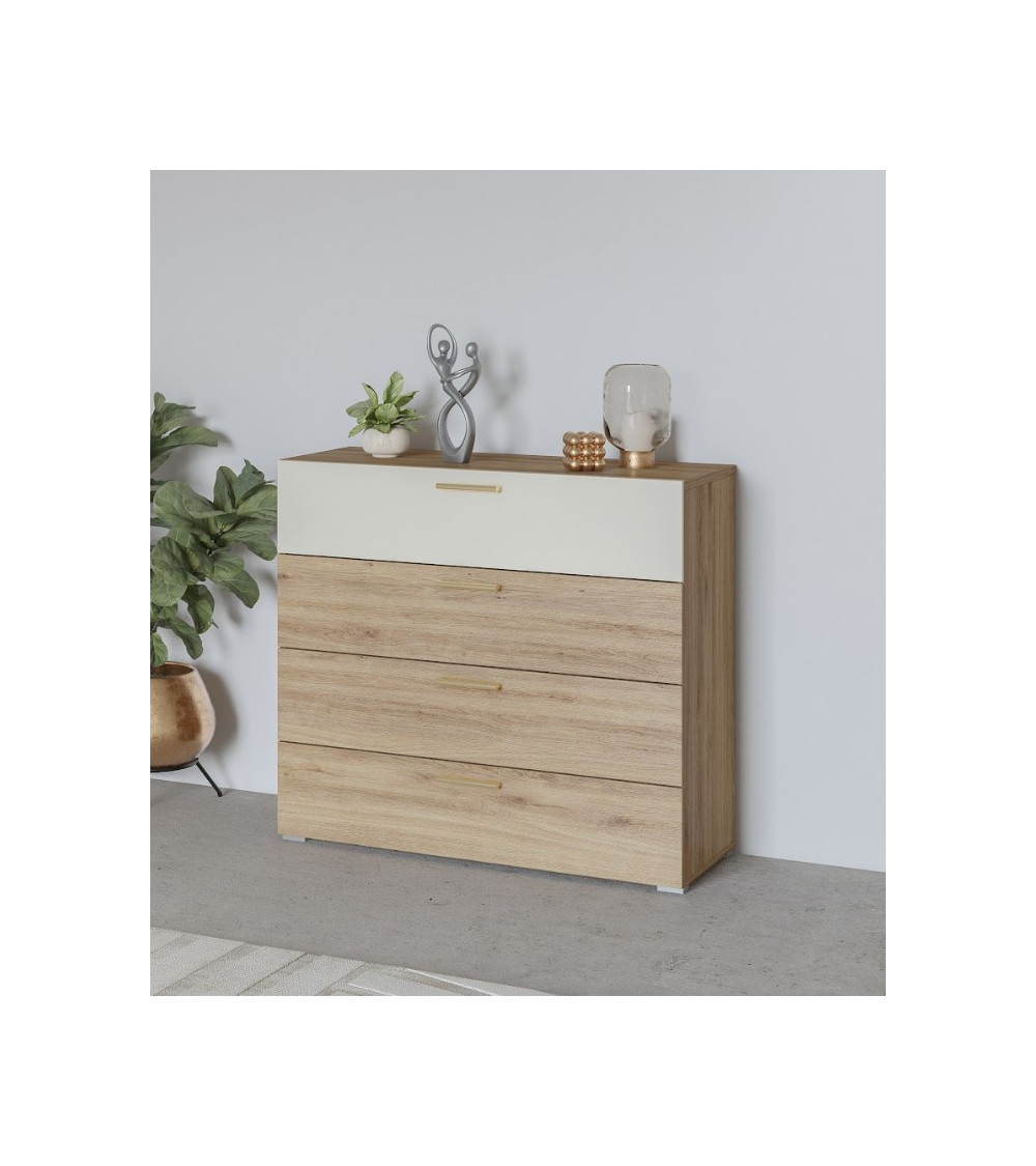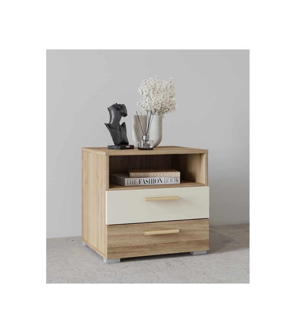 Un design chaleureux et moderne aux finitions chêne naturel et beige brillant.