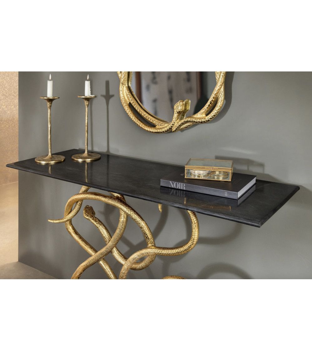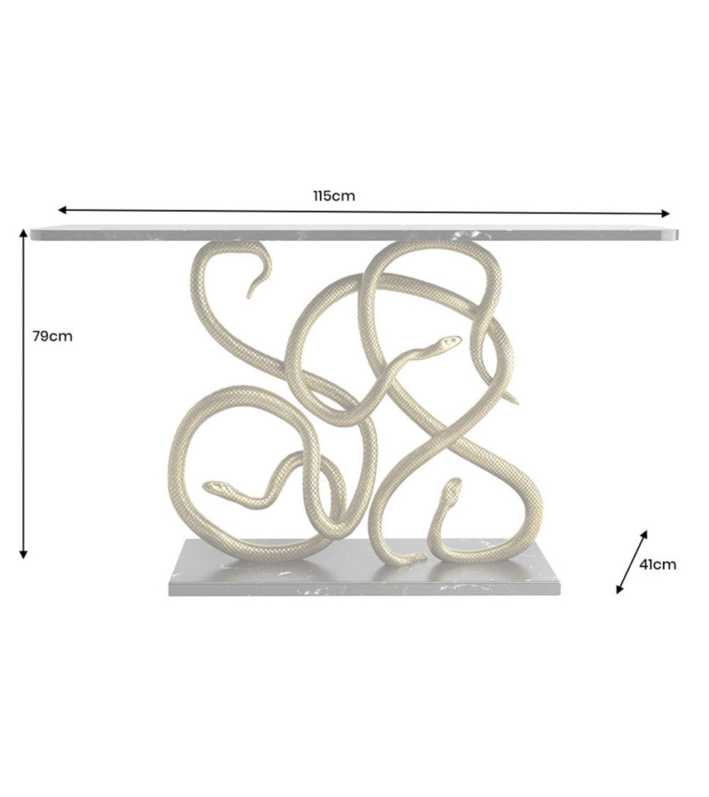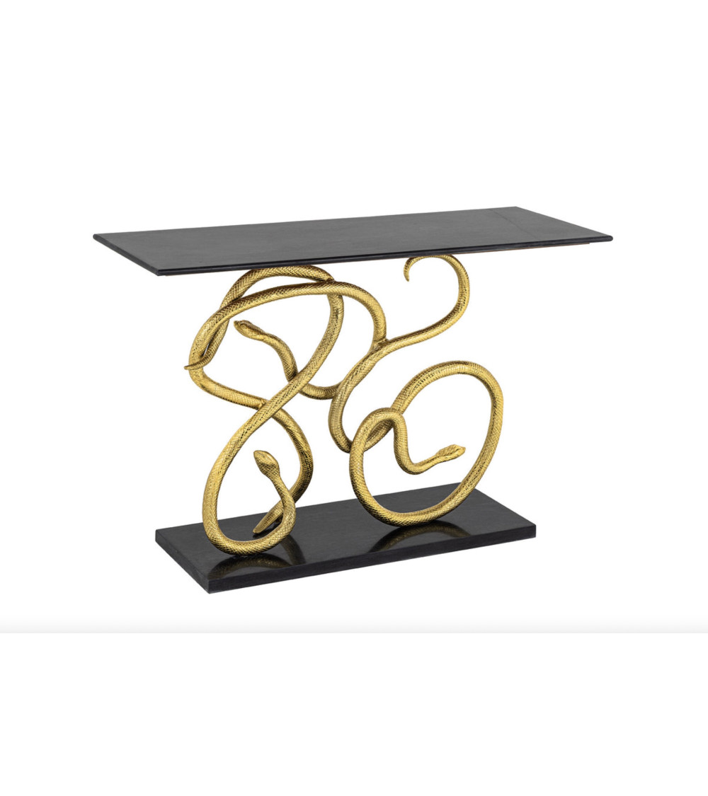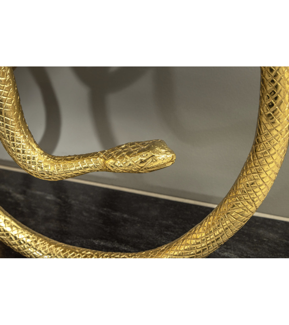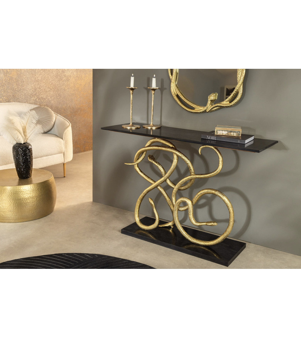 Apportez une aura luxueuse à votre entrée avec la Console WILDLIFE SNAKE 115 cm : une structure dorée élégante associée à un plateau et un socle en marbre noir poli, pour un meuble sculptural qui ne passe jamais inaperçu.