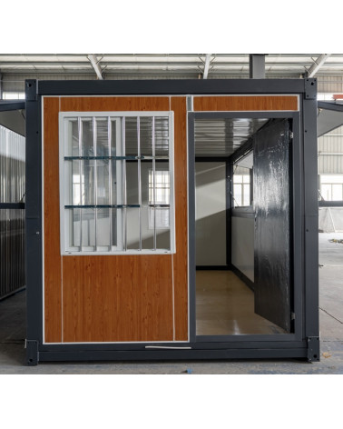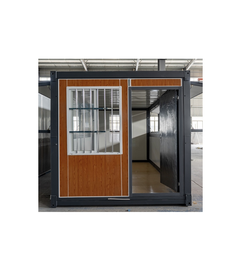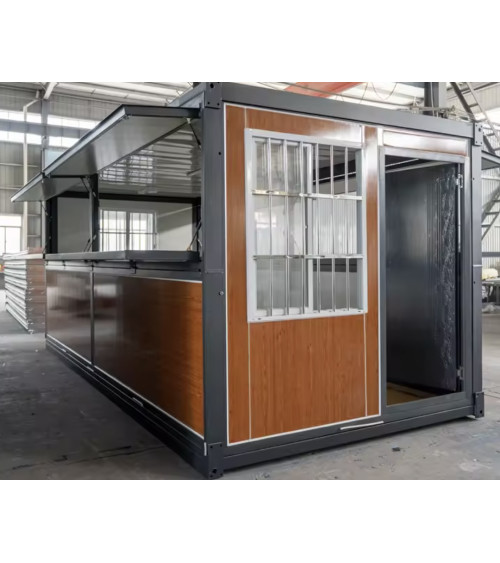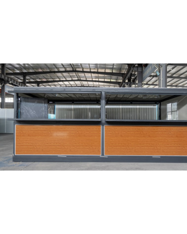 La façade associe une porte coulissante vitrée et une fenêtre sécurisée à barreaux, garantissant transparence, luminosité et protection. Le point fort de ce modèle réside dans sa grande ouverture latérale équipée d’un auvent relevable avec comptoir intégré : une solution idéale pour servir les clients, créer un espace d’accueil convivial ou mettre en avant une vitrine commerciale. Cette configuration favorise les échanges directs tout en protégeant l’intérieur des intempéries.