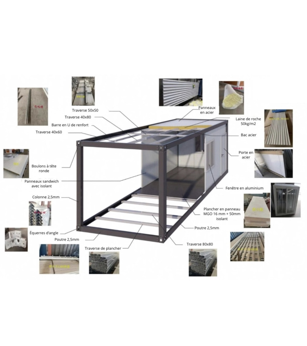 | Livraison | Il est nécessaire de prévoir, lors de la livraison, une grue pour l’installation de votre module sur votre dalle ou vos plots. La livraison s’effectue au pied du camion. |