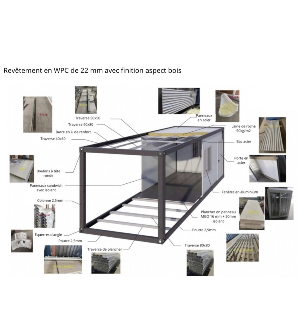 | Installation revêtement | Le revêtement de finition en WPC aspect bois est à installer après la livraison. Il doit être fixé sur le bardage en acier du module une fois son déploiement effectué. |